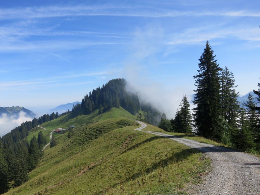 Die Schulferien in der Schweiz sind vorüber und es ist ein normaler Werktag. Deshalb ist an der Talstation der Seilbahn Dallenwil - Wirzweli, wie erwartet, wenig Betrieb. Gerade fährt eine Bahn ab, doch wir müssen noch Wanderschuhe anziehen und Ticket kaufen. Für 21,60 CHF erwerben wir ein Retour-Ticket und für 5,00 CHF lassen wir das Auto-Kennzeichen in eine Liste eintragen, damit es in unserer Abwesenheit nicht abgeschleppt wird.Kaum passieren wir das Drehkreuz, kommt auch schon die nächste freie Doppelgondel von oben an. Zehn Minuten später schauen wir bereits von der Bergstation in Wirzweli auf Dallenwil hinunter. Die ersten sechshundert Höhenmeter haben wir also schon hinter bzw. unter uns. Über dem Vierwaldstätter See hängt eine dünne Wolkenschickt, während über unseren Köpfen lediglich ein paar verwischte Kondensstreifen den stahlblauen Himmel zieren. Nachdem endlich alle Logger aktiviert sind, studieren wir zwecks Orientierung die Wanderwegweiser. Hätten wir von der Umgebung nicht eine Vorahnung, würden uns die Wanderwegweiser sehr verwirren. Einige Ziele sind gleichzeitig in entgegengesetzter Richtung aufgeführt. Doch die Richtung zu unserem ersten Etappenziel Horn ist eindeutig, immer der Sonne entgegen. Über einen Wirtschaftsweg laufen wir unter dem Gestell eines Schlepplifts hindurch, auf einen steilen und schattigen Nordhang zu. Im Gegenlicht leuchten die Mähnen und Schweife von weidenden Rössern. In einer weiten Schleife zieht sich der Wirtschaftsweg den Nordhang hinauf. Oberhalb der steilen Pferdekoppel passieren wir ein altes Bauernhaus und erfreuen uns am Tiefblick auf die Häuser von Wirzweli. Noch besser wird die Aussicht auf einer grünen Hochebene, auf der sich auch eine Kuhherde wohl fühlt. Neben Stanserhorn, Rigi, Buochserhorn und Brisen kommen nun auch Walenstöcke und Titlis zum Vorschein, und natürlich noch unzählige andere Gipfel, deren Namen wir aber nicht kennen. Die aussichtsreiche Kuhweide stösst an einen Wald, in den der breite Wanderweg eintaucht. Wir entdecken eine Alternative zum breiten Wanderweg. Eine verblasste Farbmarkierung und eine kaum sichtbare Trittspur lenken uns zu einem Durchgang im Weidezaun am Waldrand. Im dichten Wald führt uns die gerade noch erkennbare Spur dicht an einen Abgrund. Ab und zu sind durch Baumlücken und tiefe Felseinschnitte beeindruckende Blicke in die Tiefe möglich. Eine kurze Kraxelstelle ist mit einem Drahtseil gesichert. Nach gut zehn Minuten trifft unser Pfad bei der gespaltenen Flue mit dem breiteren Wanderweg zusammen. Durch den hohen Druck während der Alpenfaltung (beim Zusammenstossen von Kontinenten) zerbrach die Kalk-Flue und die Witterung sorgte und sorgt heute noch, für die Verbreiterung des Spaltes zwischen den Felsen. Durch die viele Meter hohe Spalte können wir einen schmalen Ausschnitt der Berglandschaft im Hintergrund sehen. Nach fünf Minuten haben wir auf einem breiten Wiesengrat wieder herrliche Aussicht auf beide Seiten. Wenige Meter weiter ist linkerhand auf einer Erhebung ein Gipfelkreuz zu sehen. Der Weg führt unterhalb am Hügel vorbei. Wir entschliessen uns zu einem Abstecher und steigen weglos über die Wiesen zum Gipfelkreuz hinauf. Auf der Wanderkarte ist dieser Aussichtpunkt unter dem Namen Vord. Gummen eingezeichnet. Am Gipfelkreuz werden wir mit Hundegebell empfangen. Im Westen sehen wir nun über dem Nachbarhügel Hint. Gummen, den luftigen Arvigrat, den wir heute noch überschreiten wollen. Zwischen Vord. und Hint. Gummen gäbe es die erste und einzige Einkehrmöglichkeit auf der Strecke unserer Rundwanderung. Mit einer kleinen Seilbahn ist die Gummen-Alp von Wirzweli aus leicht zu erreichen. Ein weisser Wolkenfetzen schiebt sich etwas unterhalb zwischen uns und Stanserhorn. Auch auf der anderen Seite bereichern einzelne Wolkenfetzen die herrliche Alpenkulisse, können aber nicht daran hindern, ins tiefe Engelbergertal hinunter zu sehen. Weglos laufen wir über die Bergwiese auf den Hint. Gummen und die Gummen-Alp zu. Auf halber Strecke kommt uns ein zutrauliches Wander-Kätzchen entgegen. Es läuft zwei Wanderern voraus, als wolle es den Weg zeigen. Auch das Gebell der Hunde, die am Gipfel des Vord. Gummen längst auf die Katze aufmerksam geworden sind, scheint das Kätzchen nicht zu beunruhigen. Mangelnde Begeisterung der Mitwanderer verhindert gerade noch eine Einkehr auf die einladende Terrasse der Gummen-Alp. Der Wanderwegweiser nach Egg und Laucheren zeigt direkt auf ein Haus. Unklar, ob der Weg rechts oder links das Haus umgeht, erwischen wir natürlich die falsche Seite. Ein Fremder ruft uns zurück und wir passieren das Haus auf der linken Seite. Zwanzig Minuten laufen wir fast auf einer Höhenlinie in Richtung Südwesten, anfangs auf einem breiteren Weg quer zum steilen Wiesenhang, dann auf einem schmalen Pfad durch den Wald und schliesslich wieder auf einem Wiesepfad. Vom Tal aufsteigende Nebelschwaden sorgen zwischendurch für eingeschränkte Fernsicht. Der Wiesenpfad mündet jetzt in einen Wirtschaftsweg, der ebenfalls von Hint. Gummen her kommend weiter nach Egg und Laucheren führt. Die erste Hälfte, bis zur Eggli-Hütte bzw. Eggalp, verläuft der Wirtschaftsweg über einen breiten Grat, dann durch einen Wiesenhang. An der Eggalp macht der Wirtschaftsweg zuerst einen 180-Grad-Bogen nach rechts und dann wieder nach links, gewinnt so an Höhe und passiert bei Egg die Bergstation einer kleinen Seilbahn, die vom Langboden herauf kommt. Eine Schulklasse sammelt sich am Lifthäuschen aus blankem Beton. Über eine weite Strecke ist der Wirtschaftsweg, der in Richtung Süden am Rande der Kernalp verläuft, zu übersehen. Wir folgen dem kaum ansteigenden Wirtschaftsweg und passieren nach einer viertel Stunde unweit der Schellenfluehütte eine Abzweigung, über die man nach rechts, steil zum Gräfimattstand oder zum Arvigrat hinauf steigen könnte. Aber wir bleiben auf dem Wirtschaftsweg und passieren nach einer weiteren viertel Stunde die Chälenhüt