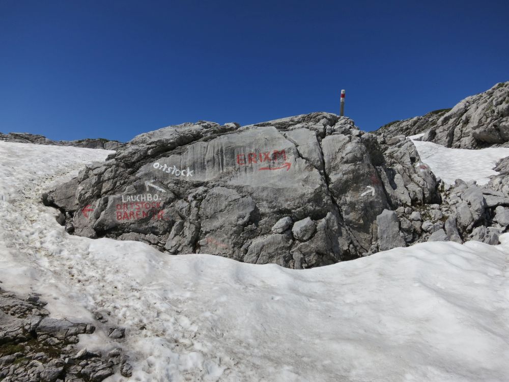 Für 23,30 Schweizerfranken lösen wir an der Talstation der Braunwaldbahn ein Ticket, das bis zur Bergstation Gumen gilt. Wir quetschen uns in die volle Standseilbahn und ab geht die Fahrt. Beim Betrachten der Zugseile denkt man besser nicht über "was wäre, wenn" nach. Auf halber Strecke kommt die Bahn von oben auf einem anderen Gleis entgegen.Von der Terrasse der Bergstation Braunwald blicken wir auf den mächtigen Gipfel des Ortstock, der wie eine Pyramide in den stahlblauen Himmel ragt. Na, ob wir den heute wohl bezwingen werden? Die Standseilbahn hat uns immerhin schon mal sechshundert Höhenmeter nach oben gebracht. Wir laufen, wie etliche andere Wanderer auch, erst mal in westliche Richtung, zur Talstation der Gumenbahn. Immer den Ortstock vor Augen laufen wir gemütlich eine viertel Stunde, etwa fünfzig Höhenmeter, und erreichen dann die schwach frequentierte Gumenbahn. Mit unserem Barcode-Ticket lässt uns das Drehkreuz anstandslos durch die Absperrung und wir setzen uns auf die heranschleichenden Doppelsessel. Quer zur Fahrtrichtung sitzend, lassen wir uns dann bequem nochmal sechshundert Höhenmeter hinauf befördern. Noch sind die meisten Sonnenschirme auf der Terrasse der Gumen-Bergstation zugeklappt und einer Einkehr ist nur schwer zu widerstehen. Auf dem Wanderwegweiser ist der Ortstock mit 3 ½ h Gehzeit angegeben. Über eine halbe Stunde lang laufen wir gemütlich einen herrlichen Höhenweg ohne nennenswerte Steigung und immer die Pyramide des Ortstocks vor Augen. Links und rechts des Weges blühen unzählige bunte Alpenblumen. Nach und nach nimmt dann die Steigung zu und schliesslich geht es im Zickzack über so manchen grossen Stein unweit von Felswänden steil hinauf. Nach einer knappen Stunde stehen wir auf einer Hochebene am Standort Bützi. Am Wanderwegweiser ist der Ortstock nun mit 3 h Gehzeit angegeben. Definitiv sind also die Gehzeitangaben zum Ortstock und/oder Bützi an der Bergstation Gumen falsch. Besorgt schauen wir in Richtung Ortstock und auf das Furggele, über das wir eigentlich zum Gipfel aufsteigen wollten. Im steilen Hang liegt noch jede Menge Schnee. Das ist uns nun doch zu riskant, denn wir müssten das Schneefeld sowohl hinauf aus hinunter. Wir beschliessen, das Risiko nicht einzugehen und stattdessen einen Schlenker über Ergismatt durch die Karrenfelder zu machen. Statt oberhalb der Legerwand in Richtung Süden zu laufen, schlagen wir jetzt eine westliche Richtung ein und folgen den roten Markierungen über die glatt geschliffenen Felsen. Wir erleben eine spannende Felslandschaft, ein Labyrinth mit vielen Spalten und Löchern. Dabei überqueren wir auch so manches Schneefeld in schattigen Felsnischen. Auf einem mächtigen Feldbrocken finden wir nach einer dreiviertel Stunde diverse Schriften, die verschiedene Ziele anzeigen. Etwa ein Kilometer vor Ergismatt biegen wir nach Süden ab und steuern direkt den Bärentritt an. Eine Trittspur ist nun nicht mehr zu sehen und so sind wir auf die roten Markierungen an den Felsen angewiesen. Die finden wir erst wieder nach dem Überklettern so mancher Felsstufen in gedachter Richtung. Langsam nähern wir uns dem steilen Nordhang des Flätstock, einem Vorgipfel des Höch Turm. Mehr und mehr geht es abwärts und die Schneefelder häufen sich. Nach einer dreiviertel Stunde taucht vor uns eine leuchtend grüne Ebene mit einem glasklaren, geschwungenen Bächlein auf, der Lauchboden. Im Hintergrund begrenzen die sonnigen Schneefelder unterm Furggele und der pyramidenförmige Gipfel des Hoch Türm die idyllische Ebene. Die Kante unter dem Lauchboden nennt sich Bärentritt und ist für Bergwanderer mit dem Schwierigkeitsgrad T4 (Hand anlegen) bewertet. Über die Kante geschaut, hat man nicht nur eine komplette Übersicht über ganz Braunwald, sondern sieht auch ganz hinunter in das Linthal und natürlich auch zu den gegenüberliegenden Bergen wie Kärpf und Haus Stock. Der ideale Ort für eine ausgiebige Rast. Und für Hobbyfotografen bedeutet Rast eine eifrige Motivsuche in der Umgebung. Sobald nur einer aufsteht und den Rucksack anfasst, entsteht daraus automatisch eine Aufbruchstimmung und die Wanderung wird fortgesetzt. Ganz moderat beginnt der Abstieg über den Bärentritt auf einem Serpentinenpfad. In der Tiefe kommt nun das kleine Bergetenseeli zum Vorschein. Nach einer viertel Stunde wird es dann ziemlich steil und der Weg führt durch einen Felskamin. Über viele Felsstufen und mit einem Drahtseil gesichert ist der Abstieg aber völlig ungefährlich. Spannender und etwas heikler wird der Abstieg, wie der schmale Pfad über ein Felsband in der nahezu senkrechten Wand verläuft. Aber auch hier kann man sich an einem Drahtseil festhalten, so dass, solange man sich festhält, kaum was passieren kann. Tief unten sind schon die weiten Serpentinen im Schotterhang zu sehen, die wir in 5 Minuten erreichen. Eine viertel Stunde sind wir bis zum Bergetenseeli unterwegs. Im oberen Teil rutschen wir noch den losen Schotter ab, während wir im unteren Teil die prächtigen Blüten des gelben Enzians mit der steilen Legerwand im Hintergrund bewundern und fotografieren können. Näher am Bergetenseeli ähnelt dieses eher einer dunklen, grünen Wiese statt einem wassergefüllten Becken. Ab hier bieten sich zwei verschiedene Wege an, um nach Braunwald oder Linthal zu gelangen. Da wir den geplanten Ortstock auslassen mussten, entscheiden wir uns für die weitere Variante über Nussbüel. Auf eine Distanz von etwa zwei Kilometern steigt ein schmaler Pfad ungefähr hundert Höhenmeter an und durchstreift grüne Sträucher und Büsche. Linkerhand haben wir ständig einen herrlichen Tiefblick auf die Hochebene von Braunwald und weiter hinunter ins Linthal. Kurz vor der Alm Rieter Ortstafel passieren wir ganz markante Felstürme, die Tüfels Chilchli genannt werden. Völlig ausgetrocknet freuen wir uns bei der Alm auf kalte Milchmixgetränke direkt von der eisgekühlten Kuh. Feste Preise gibt es nicht, jeder zahlt das, was es