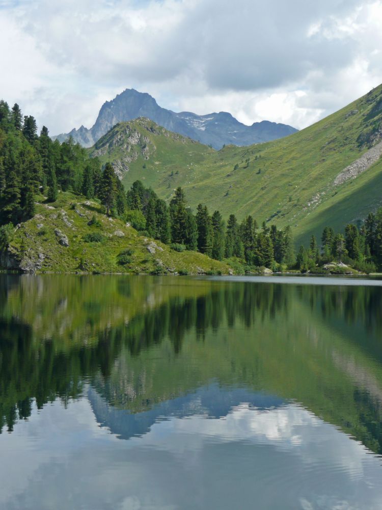 Etwas unterhalb des Maloja-Passes stellen wir unser Fahrzeug auf einem Parkplatz ab. Nebenan können von einer Aussichtkanzel auf einem Fels die Serpentinen der Passstrasse von oben betrachtet werden. Wanderwegweiser sind nicht zu sehen, aber wir finden einen ausgetretenen Pfad, der in die Richtung führt, in die wir gehen wollen.Über glatte Felsen durch den Wald und dann durch Lupinenfelder trifft der Pfad schliesslich auf den Hauptweg, wo dann Wanderwegweiser zu finden sind. Bis zum Fluss Orlegna laufen wir leicht abwärts. Den tiefen Einschnitt des Flusses überqueren wir über eine Brücke. Auf einem Schotterweg laufen wir nun ein paar hundert Meter, bis ein Wanderwegweiser auf die Bergwiese zeigt. Eigentlich führt der Wanderweg zum See L.da Bitabergh, den wir nicht aufsuchen wollen. Doch nach einigen Höhenmetern kommt eine Abzweigung zum See L.da Cavloc. Auf dem schmalen Pfad, der insgesamt 100 Höhenmeter aufsteigt, marschieren wir in einer knappen Stunde bis zum See L.da Cavloc. Beim Überschreiten einer Passhöhe kommt zum ersten mal das dunkle Blau des Sees zum Vorschein. Entlang des Westufers, dessen Länge bestimmt einen halben Kilometer misst, bis zur anderen Seite des Sees, umrunden wir diesen bis zur Gartenwirtschaft, wo wir einkehren wollen. Auf der stillen Wasseroberfläche bestaunen wir die Spiegelungen der umliegenden Berggipfel. Auf der Terrasse der Gaststätte lassen wir uns nieder und geniessen in der Sonne einen Apfelmost. Nach der Rast setzen wir die Umrundung des Sees fort. Über Felsen und Holzstege, durch Felsspalten und schliesslich eine steile Treppe hinunter führt der abwechslungsreiche Pfad meist in Ufernähe. Für die gesamte Umrundung benötigen wir eine halbe Stunde. Am Ende der Runde gehen wir den Weg, den wir gekommen waren, bis zur Passhöhe. Dort zweigt ein Pfad in Richtung Maloja ab. In Serpentinen geht es einen schmalen Pfad etwa 100 Höhenmeter hinunter, bis zum Fluss Orlegna. Ab hier nehmen wir den gleichen Weg, den wir gekommen waren, zurück zum Parkplatz. | ||||||||||