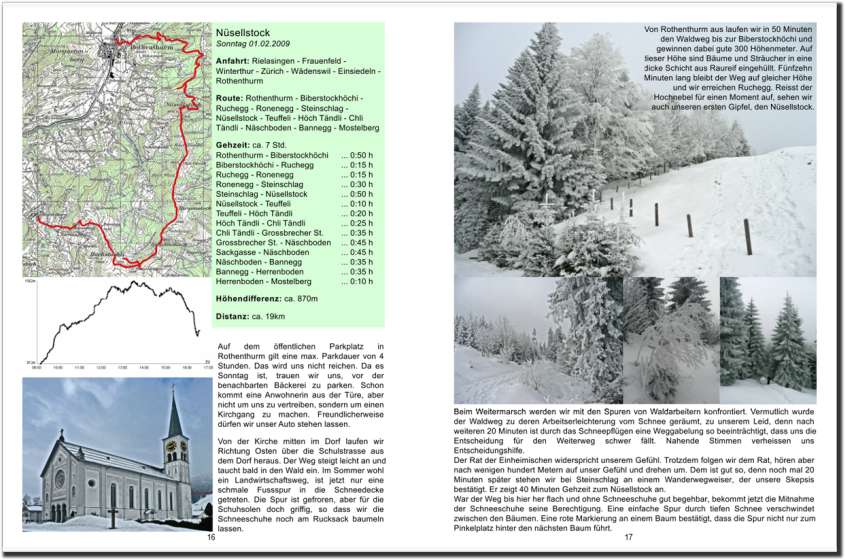 Zu jeder Wanderung werden Kartenausschnitt, Höhenprofil, technische Daten, Tourenbeschreibung und eine Auswahl von Bildern im Buch dargestellt.