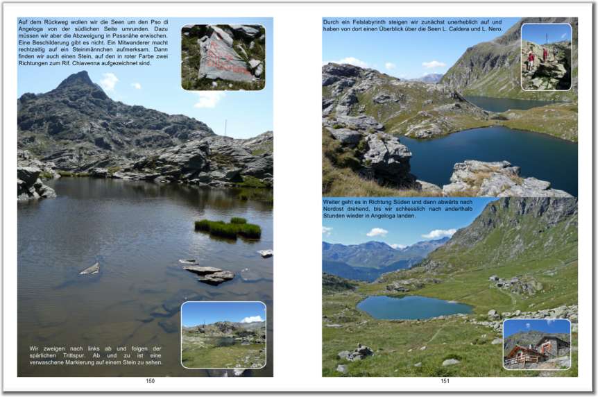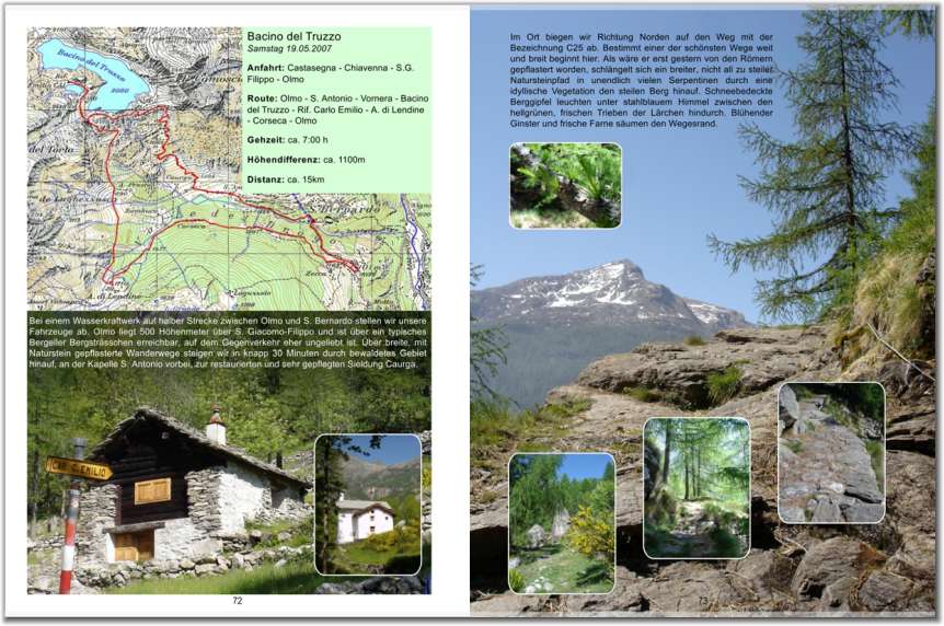 Zu jeder Wanderung werden Kartenausschnitt, technische Daten, Tourenbeschreibung und eine Auswahl von Bildern im Buch dargestellt.