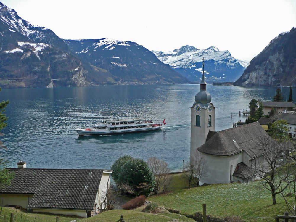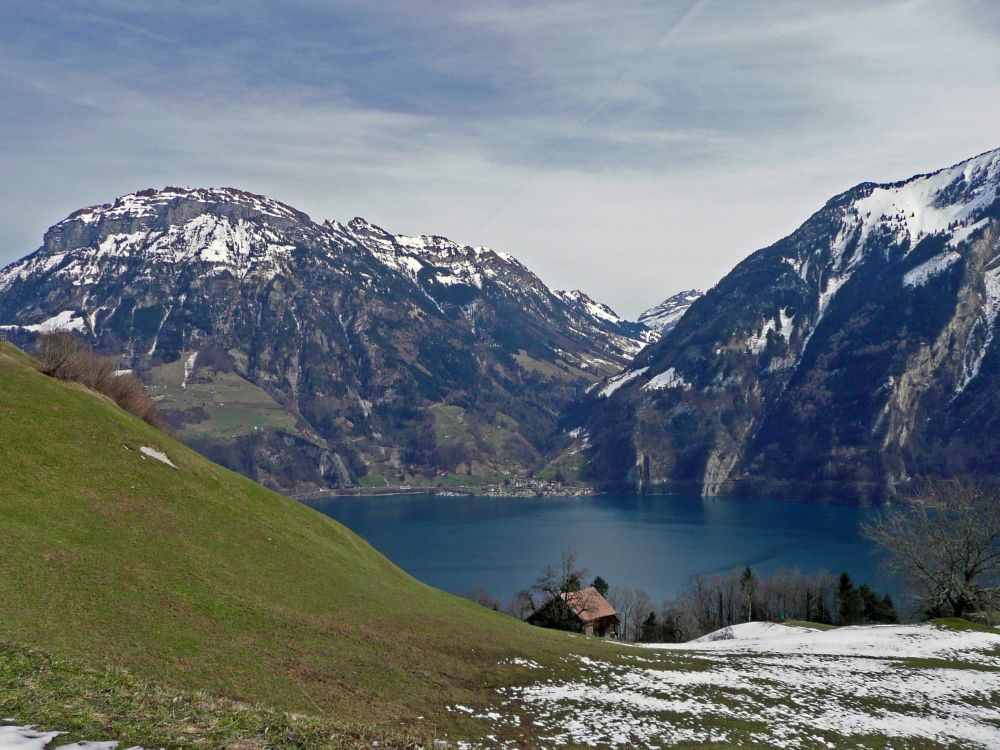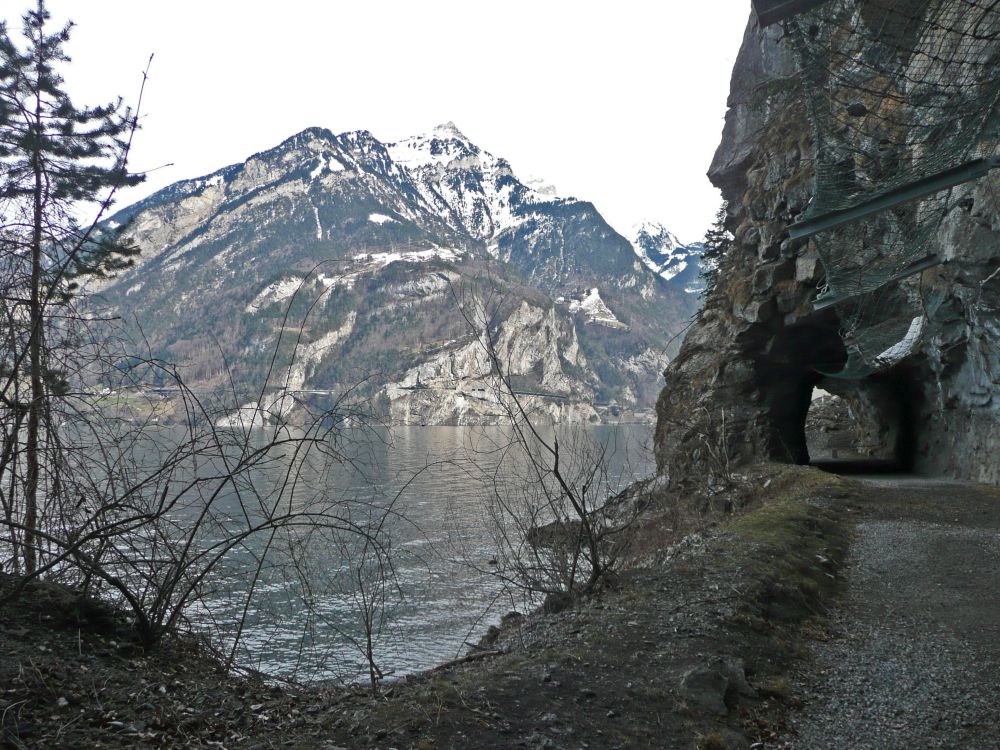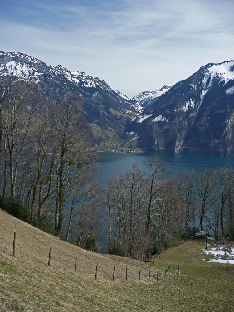 In der Nacht vor der Wanderung kippt das Vorhaben, den Weg der Schweiz von Flüelen nach Brunnen zu machen, wegen neuen Informationen aus dem Internet. Vor Ostern ist ein Teil des Weges bei Sisikon wegen Steinlawinen gesperrt. Für die alternative Wanderung, dem Abschnitt zwischen Treib und Flüelen müssen wir zwingend die Fähre von Brunnen nach Treib um 9:49 Uhr erwischen, da eine nächste Fährverbindung an diesem Tag Stunden auf sich warten lässt.Gross ist das Bibbern, wie wir bei der Umfahrung von Zürich im Stau stecken bleiben. Doch zehn Minuten vor Abfahrt der Fähre treffen wir in Brunnen ein. In weniger als 10 Minuten fahren wir mit dem Schiff für 5,40 CHF pro Person, fast als einzige Passagiere, von Brunnen nach Treib. Eine Schaffnerin der Standseilbahn Treib - Seelisberg versucht, uns als Fahrgäste zu gewinnen. Wir müssen ihr jedoch einen Korb geben, denn wir sind zum Wandern angereist. Auf der Schattenseite folgen wir dem ansteigenden Wanderweg in Richtung Seelisberg. Schnell gewinnen wir an Höhe und die Aussicht wird mit jedem Schritt noch schöner. Im Osten glänzen die schneebedeckten Gipfel von Pilatus und Buochserhorn in der Sonne und im Westen beeindrucken die beiden Spitzen vom kleinen und grossen Mythen. Nach zwanzig Minuten kreuzen wir den Rütliweg, der zum Ursprung der Eidgenossenschaft führt. Für eine Schleife nutzen wir das schmale Asphaltsträsschen, verlassen dieses aber bald wieder, um über eine Wiesenpfad abzukürzen. Der Wanderweg ist noch nicht für seine Bestimmung hergerichtet, aber das Geäst, das Forstarbeiter beim Lichten von Sträuchern haben liegen lassen, kann uns nicht aufhalten. Nach weiteren 10 Minuten stossen wir an die Gleise der Seelisbergbahn, die wir aber nicht überqueren müssen. Noch einmal kürzen wir eine Schleife des Asphaltsträsschens über einen Wiesenpfad und einen schneebedeckten Waldpfad ab. Die Schneehöhe nimmt stetig zu, doch Fussspurem erleichtern uns das Gehen. Zwischen Häuser und Hecken hindurch erreichen wir nach insgesamt 50 Minuten die Bergstation der Seelisbergbahn. Schnell passieren wir ein nobles Berghotel, vor dem dicke Autos parken und die Kleiderordnung der Passanten zu unserer Wandererkluft nicht kompatibel ist. Wir folgen ein paar Minuten der Dorfstrasse in Richtung Süden und streifen dabei ein paar einfachere Hotels, die Winterpause machen. An einem Aussichtspunkt mit Panoramatafel überblicken wir den gesamten Urnersee. Dieser wird vom Weg der Schweiz, dessen ersten Abschnitt wir heute machen, umrundet. Der Fronalpstock auf der anderen Seeseite sieht von hier aus ganz ungewohnt aus, fast wie eine Pyramide. Und das dicke Gipfelkreuz auf dem Rophaien ist deutlich zu erkennen. Der Anblick beider Gipfel wird uns während der gesamten Wanderung erhalten bleiben. Eine kleine Kapelle lockt uns auf die andere Strassenseite. Wir schauen uns die Deckenmalereien im Inneren der Kapelle an. Durch den Torbogen des Kapelleneingangs erblicken wir eine Dachkuppel des alten Grand Hotels. Bei näherer Betrachtung sehen wir, dass das in die Jahre gekommene Gebäude nicht mehr als Hotel genutzt wird. Seit über 40 Jahren wird in den veralteten Hotelanlagen Transzendentale Meditation gelehrt. Seit einigen Jahren ist der Meister Maharishi Mahesh Yogi tot und das Hotel soll für 100 Mio. CHF verkauft werden. Bei so einem Schnäppchen sollte man doch glatt zuschlagen. Wir geniessen noch einmal den herrlichen Blick über den Urnersee, bevor wir weiter in Richtung Süden zum Oberdorf laufen. Über einem schlossähnlichen Haus sehen wir zum ersten mal die senkrechten Gipfelwände des Niderbauen. Vergangenen September, wie wir den Gipfel des Niderbauen bestiegen haben, versteckten sich die Wände in Wolken. Das war sicher gut so. Am Ortsrand vom Oderdorf taucht der Wanderweg in den Tannwald ein. Ein Rundgang durch den Tannwald ist mit 35 min beschildert. Wäre der Rundweg nicht geräumt, müssten wir jetzt durch den Schnee stapfen. In einem Bogen führt der Weg bis an die Oberkante einer Klippe, wo wir wieder einen herrlichen Blick über den ganzen Urnersee haben. Am südlichen Waldrand mündet der Spazierweg in eine Asphaltsträsschen. Vor einem kleinen Häuschen hängt eine Seilbahnkabine am Drahtseil das bis zur einer Felswand hinauf gespannt ist. Wenige Minuten später schwebt die Seilbahnkabine in luftiger Höhe und ist nur noch als kleiner roter Punkt am blauen Himmel auszumachen. Ein Mann, der gerade den Blick auf das zugefrorene Seeli geniesst, empfiehlt uns, einen Abstecher zum Schloss Beroldingen zu machen. Das Asphaltsträsschen führt am Schloss vorbei. Ein Wanderwegweiser zeigt einen alternativen Weg zum Schloss an. Allerdings führt dieser einen schattigen, schneebedeckten Hang hinauf. Da kein Widerstand von den Mitwanderern zu vernehmen ist, wagen wir den Schneepfad. Dank eines Vorläufers, der Spuren im Schnee hinterlassen hat, macht der Aufstieg über ein paar Serpentinen keine Probleme. Auf einer Anhöhe ist Schloss Beroldingen mit 5 Minuten Gehzeit angegeben. Schon nach einer Minute taucht das Schlösschen mit schneebedeckten Berggipfeln im Hintergrund auf. Laut Erzählung soll es von einer Künstlerin bewohnt werden. Wir betrachten es aus der Ferne und setzen unseren Weg in Richtung Südosten fort. Erneut richtet sich der Blick auf den Urnersee, wo wir im Süden jetzt den Zufluss der Reuss deutlich sehen können. Unser kleiner Umweg am Schloss vorbei mündet nun wieder in das Asphaltsträsschen, das von Seelisberg in Richtung Süden verläuft. Von zwei Männern, die gerade ihre Arbeit beenden, erfahren wir, dass das Asphaltsträsschen in 2 km endet. Dort gäbe es eine geeignete Gelegenheit zu Rasten. Tatsächlich finden wir am Ende der Strasse eine Bank und in einem Unterstand sogar ein ganzes Duzend Bänke und Tische, die aber noch nicht für den sommerlichen Ansturm bereit gestellt sind. Ein aus Naturstein gepflasterter und durch Holzgeländer gesicherter Fussweg bringt uns nach der Rast in 30 Minuten und 
