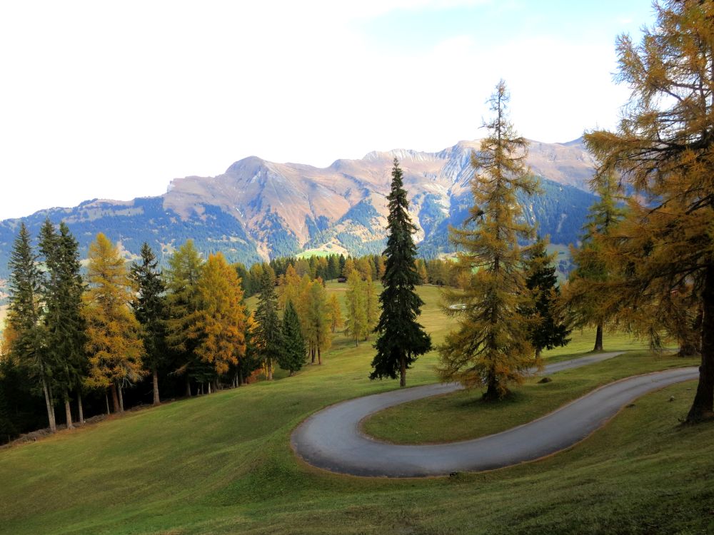 Zwischen Usser-Praden und Inner-Praden macht die Strasse im Sagentobel einen starken Linksbogen. In diesem Bogen stehen ein paar Parkplätze zur Verfügung, die wir als Treffpunkt und zum Parken nutzen. Noch ist die Sonne zu tief und schafft nicht den Weg über die Berge auf diese Seite des Tales mit dem Namen Schanfigg.Auf der gegenüberliegenden Strassenseite zeigt ein Wanderwegweiser unter anderem auch in Richtung Tobel, in dem ein rauschendes Bächlein herunter sprudelt. Während wir im schattigen Wald eine Treppe hoch steigen, sehen wir im Norden den Montalin und im Nordwesten die Calanda im strahlenden Sonnenschein leuchten. Die Nadeln der Lärchen sind zwar herbstlich gelb, was jedoch im morgendlichen Schatten nicht so richtig zur Geltung kommt. Auf breiten Pfaden steigen wir Richtung Süden an und vernehmen dabei mit dem rechten Ohr immer das Rauschen des Baches, der durch den Sagentobel fliesst. Schliesslich überqueren wir diesen Bach nach einem Rechtsbogen über einen Holzsteg und gelangen an den Waldrand. Bei den Hütten von Untersäss erlauben wir uns eine kleine Trinkpause und geniessen den freien Blick zur sonnigen Calanda hinüber. In einer weiten Schleife steigen wir anschliessend auf einem Wirtschaftsweg fünf Minuten weiter an und stossen an eine Weggabelung mit Wanderwegweiser. In zwei verschiedene Richtungen ist Joch mit einer Gehzeit von anderthalb Stunden angeschrieben. Eigentlich sollte es ab hier auf dem breiten Wirtschaftsweg auf einer Höhenlinie einen halben Kilometer Richtung Westen, und dann im Zickzack den steilen Waldhang hinauf gehen. Doch der schmale Pfad, der gleich nach Süden im Wald verschwindet, macht einen spannenderen Eindruck. Hoch über einem Bach folgen wir also dem schmalen Pfad und kreuzen nach knapp zehn Minuten den Bach über einen Holzsteg. In den folgenden Minuten kreuzen wir noch weitere Seitenarme des Baches. Nahe Furgglis zweigen wir an einem Wanderwegweiser nach rechts ab. Linkerhand blicken wir auf eine parkähnliche Landschaft. Einzelne, gelb leuchtende Lärchen sind auf einer Bergwiese verteilt, durch die sich ein kurviges Asphaltsträsschen schlängelt. Nach etwa 10 Minuten biegen wir an einem weiteren Wanderwegweiser erneut nach rechts ab. Auf einem breiteren Wirtschaftsweg laufen wir nun leicht ansteigend etwas mehr als einen Kilometer in Richtung Südwesten. Dann steigen wir nach links einen nassen und morastigen Wiesenhang hinauf. Nach wenigen Minuten passieren wir das Lifthäuschen eines Schleppliftes, an dessen Fassade eine Uhr tatsächlich die richtige Uhrzeit anzeigt. Das Gelände bleibt vorerst noch ziemlich feucht und die Bäume werden weniger. Der Pfad macht einen Rechtsbogen und wendet sich mehr und mehr nach Westen dem Joch zu. Auf der Höhe ist immerhin schon das Dach des Bergrestaurants Jochalp zu sehen. Ob das Berggasthaus geöffnet hat, wissen wir zum jetzigen Zeitpunkt noch nicht. Endlich dürfen wir aus dem Schatten des Gürgaletsch heraus treten und den sonnigen Wiesenhang zum Joch hinauf laufen. Dort passieren wir nach gut zwanzig Minuten das Restaurant Jochalp, das zu unserer ganz grossen Freude geöffnet hat. Wir lassen die Terrasse aber erst mal links liegen und laufen weiter, bis zur höchsten Stelle des Jochs. Glatt geschliffene, mannshohe Felsen zieren die Höhe des Churer Jochs. Eine Sitzbank lädt zum Verweilen ein. Wir haben eine herrliche Sicht auf Ringelspitz, Calanda, Chur, das Rheintal und den Eingang des Schanfigg. Nach dem obligatorischen Gruppenfoto kehren wir zum Restaurant zurück, wo wir uns eine Einkehr nicht verkneifen können. Obwohl wir eine Mitwanderin am Joch zurück lassen, stellt und die Bedienung noch einen zusätzlichen Stuhl an unseren Tisch. Sie hat uns wohl beim vorherigen Vorbeilaufen schon abgezählt und mit unserer Rückkehr gerechnet. Lange halten wir es auf der Terrasse aus, bevor wir unsere Wanderung nach Westen über die Wiesen Tour fortsetzen. Nicht einmal eine halbe Stunde laufen wir über Wiesenpfade und durch einen Wald abwärts, bis wir bei Älpli an einer schönen Hütte einen einladenden Sitzplatz antreffen. Vielleicht ist es die letzte Gelegenheit, bei guter Aussicht in der Sonne zu sitzen. Das wollen wir nutzen. Kaum sitzen wir, kommt der Besitzer der Hütte und freut sich über Besuch. Wie er nach einer kurzen Unterhaltung anfängt, uns abzuzählen, ahnen wir schon was. Er verschwindet kurz in der Hütte und erscheint gleich wieder mit einer Karaffe Most und Gläsern. Die nette Unterhaltung dauert etwas länger und auf die erste Karaffe folgt noch eine zweite. Erst nach über einer Stunde können wir uns losreissen. Über Wiesenpfade und Waldwege laufen wir in zwanzig Minuten 250 Höhenmeter nach Oberhof hinunter. Dort verlieren wir auf den gemähten Wiesen fast den Pfad. An einem Wanderwegweiser unterhalb der Holzhäuser geht es scharf links einen Wirtschaftsweg nach Runcalier hinunter. Dort zweigt scharf rechts ein Wirtschaftsweg nach Praden ab. Auf einem Wirtschaftsweg laufen wir erst ein Stück direkt auf Chur zu. Später macht der Weg einen weiten Rechtsbogen, bis er schliesslich Richtung Osten verläuft. Nach etwas mehr als einem Kilometer zweigt nach rechts an einem Wanderwegweiser ein Pfad in Richtung Usser Praden ab. Nach knapp fünf Minuten queren wir über einen Holzsteg im Steinbachtobel einen Bach. Durch einen Laubwald laufen wir nun nordwärts hinunter. An einer Gabelung ist am rechten, steil ansteigenden Pfad eine Markierung an einem Baum zu sehen. Etwas missmutig steigen wir über das rot gefärbte Laub hinauf, durchstreifen einen Abschnitt mit gelben Lärchen und stehen schliesslich über den Holzhäusern von Usser Praden. Hinter den Häusern entlang, dann zwischen den Häusern hindurch, laufen wir zur Strasse, wo wir nach weniger als fünf Minuten den Parkplatz im Sagentobel erreichen. | ||||||||||||||||||||||