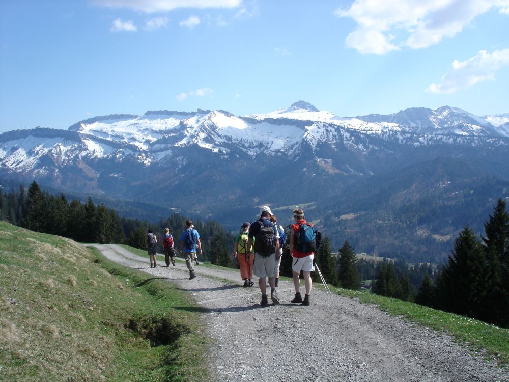 Als Ausgangspunkt der Wanderung wählen wir die Kirche von Sibratsgfäll. Innerhalb von 5 Minuten trudeln alle Teilnehmer am Treffpunkt ein. Das ist erfreulich, zumal sie aus dem Schwarzwald und fast der gesamten Bodenseeregion kommen. Auf einem Landwirtschaftsweg gewinnen wir in ein paar Kehren schnell an Höhe. Belohnt werden wir durch einen Tiefblick auf Sibratsgfäll und einen Weitblick auf die Berge um die Winterstaude, die allesamt noch ihr weisses Schneekleid tragen. Nach einer halben Stunde Gehzeit verlassen wir den Landwirtschaftweg und steigen über einen Wiesenpfad steil hinauf zur Hocheggalpe. Inzwischen haben sich alle ihrer warmen Jacken entledigt. Nach einer kurzen Trinkpause verlassen wir die Hocheggalpe wieder auf einem Landwirtschaftsweg in Richtung Osten, zunächst etwas abwärts und dann leicht aufwärts, bis wir nach etwa 2 km und 30 Minuten Gehzeit die Lustenauer Riesalpe erreichen. Hier gibt es einiges zu schauen. Von einer Alm steht zwar noch das Wohngebäude, der angrenzende Stall ist jedoch den Berg hinunter gerutscht. Eine kleine Kapelle erinnert wegen der Schräglage an den Turm von Pisa. Während die Einen die Speicherkarte Ihrer Digitalkamera füllen, kümmern sich die Anderen um ihren Flüssigkeitshaushalt. Jetzt steigt der Landwirtschaftsweg unangenehm an. Dafür haben wir freien Blick zum Hohen Ifen und die Felskanten des Gottesacker. Nach einer weiteren halben Stunde erreichen wir die Bereuters Neualpe. Ein schneebedeckter Hügel unweit der Alpe trägt sogar ein Gipfelkreuz. Der Landwirtschaftsweg endet bei der Alpe. Die letzten Meter zum Gipfelkreuz stapfen wir durch den Schnee. Der anfänglich sichtbare Pfad mündet schnell in unzählige Kuhpfade entlang eines sonnigen Hanges. Wegmarkierungen tauchen lange nicht mehr auf. Ohne an Höhe zu verlieren verfolgen wir einige Zeit die Kuhpfade, bis wir an einem Abgrund stehen. Ein Abstieg wäre wohl möglich aber nicht ohne Risiko. Wir entscheiden uns für die harmlosere Variante und umgehen den Abgrund. Unterhalb des Wiesenhangs finden wir wieder Markierungen und gelangen so zum Sättele. Hier wollen wir den Wanderweg verlassen und über eine in der Wanderkarte eingezeichnete Skiroute zum Gipfelgrad des Feuerstätterkopfes aufsteigen. Dass Skirouten auch für Wanderer einfach begehbar sind erweist sich schnell als Trugschluss. Der Hang wird sehr steil und es empfiehlt sich, nicht zurück zu schauen. Eine Schlüsselstelle lässt sich auf zwei Arten überwinden. Ein Baum mit dichtem Geäst versperrt den Weg auf dem schmalen Grat. Mutige umgehen den Baum und halten sich an seinen Ästen fest. Andere krabbeln durchs Geäst hindurch. Danach befinden wir uns etwa auf der Höhe des Feuerstätterkopfes. Auf einem breiteren Grat, der halbseitig von Schnee bedeckt ist, erreichen wir nach einigen hundert Metern das Gipfelkreuz des Feuerstätterkopfes. Am Gipfel treffen wir den ersten und einzigen fremden Wanderer auf dieser Tour. Wir gönnen uns eine längere Rast, bevor wir über den Nordhang absteigen wollen. Seit den letzen Schneefällen wurde der Weg am Nordhang nicht mehr begangen. Während am Anfang der Pfad zwischen den Sträuchern hindurch noch erkennbar ist, mündet er bald in ein ziemlich steiles Schneefeld. Abenteuerlich kämpfen wir uns den Hang hinunter, bis wir endlich wieder Wegmarkierungen finden. Aber schon nach wenigen Metern endet der Pfad wieder am Rande eines Schneefeldes. Kreuz und quer irren wir durch den Wald, immer auf der Suche nach schneefreier Fläche. Das Gelände wird zunehmend feuchter, prall gefüllt mit Wasser, wie ein Schwamm. Schliesslich sichten wir wieder Markierungen und bei der Neuburgalpe auch einen Wegweiser. Wie in einer anderen Klimazone verläuft der weitere Pfad entlang eines warmen und trockenen Südhanges. Bei der Hochriesalpe trifft dieser Pfad auf den Landwirtschaftsweg, der in vielen Kehren 400 Höhenmeter hinunter nach Sibratsgfäll führt. Trotz katholischem Kirchenfest finden wir im Dorfgasthaus einen grossen, freien Tisch auf der Terrasse und lassen dort die abenteuerliche Wanderung ausklingen. | |||||||||||||||