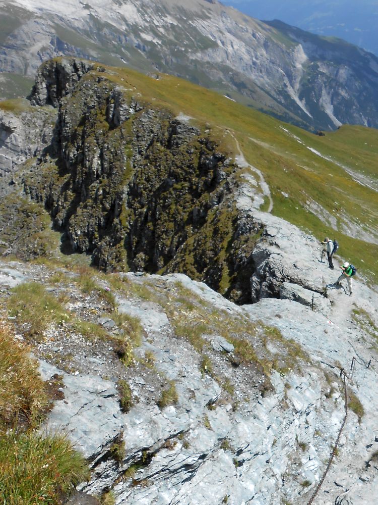 Auf dem schmalen Bergsträsschen von Flims nach Fidaz biegen wir nach einem guten Kilometer links ab und fahren noch wenige Hundert Meter zur Siedlung Scheia hinauf. Obwohl heute, am Schweizer Nationalfeiertag, überall zahlreich Gäste zu erwarten sind, erlaubt uns der Wirt vom Restaurant Haldenhaus, zwei Autos am Rande des Restaurantparkplatzes auf der Wiese abzustellen.Wir verlassen die Siedlung Scheia auf einem Wirtschaftsweg in Richtung Osten. Schon von Beginn an ragen linkerhand die senkrechten Felswände des Flimserstein in den stahlblauen Himmel. Irgendwo muss über zwei bewaldete Podeste hinweg, ein Klettersteig durch die Wand verlaufen. Nach 10 Minuten Gehzeit lesen wir auf einer Informationstafel, dass es sich beim Historischen Klettersteig, namens Pinut, um den ältesten Klettersteig der Schweiz handelt. Bei ganz genauem Hinschauen sehen wir dann weit oben, in einer schattigen Nische ein kleines Stück des Steges an der senkrechen Felswand kleben. Unser Weg hält sich unterhalb der Felswand und kreuzt nach gut 5 Minuten als schmaler Pfad die Route des Klettersteigs, der von Fidaz aus nach Norden auf den Flimserstein aufsteigt. Immer näher rückt unser Pfad an die steile Felswand heran. Nach einer knappen dreiviertel Stunde stossen wir an die Spitzkehre des Bergsträsschens, das Bargis mit Flims verbindet. Vom Bergsträsschen zweigt nach links ein Höhenweg nach Bargis ab. Leise vernehmen wir das Signalhorn des Postbusses, der irgendwo auf dem Bergsträsschen unterwegs ist. Viele Orchideen, deren Blütezeit langsam zu Ende geht, sind am Wegesrand zu bewundern. Nach der Unterschreitung eines überhängenden Felsens ermöglicht ein Steg die Querung einer sehr steilen Geröllhalde. Nach einer Gesamtgehzeit von etwas mehr als einer Stunde mündet der Pfad in das Bergsträsschen, auf dem wir in weniger als fünf Minuten bis zum Berghaus Bargis laufen. Musik schallt aus den Lautsprechern und die Terrasse ist auch schon gut mit Besuchern besetzt. Ein Zelt deutet auf ein Programm auf Grund des Nationalfeiertags hin. Auf einem grösseren Podest steht ein einzelner Tisch mit Bänken und blinzelt uns zu. Es kostet viel Überwindung, der Einladung zu wiederstehen, aber noch haben wir eine Einkehr nicht verdient. Wir blicken Richtung Norden auf eine grüne Hochebene, eingebettet zwischen senkrechte Felswände auf der linken Seite und steile Waldhänge auf der rechten Seite, und mitten durch fliesst das Flüsschen Aua da Mulins. Einzelne Holzhäuschen sind malerisch in Flussnähe verstreut. Gleich nach dem Berghaus Baris verführt uns ein Wegweiser zu einem Abstecher an einen Aussichtspunkt. Nach links zweigt ein Pfad ab und endet nach wenigen Hundert Metern an einer Bergkante mit herrlicher Aussicht. Rechts sehen wir, knapp an einer Felskante vorbei, noch die Häuser von Flims, vor uns die Berge von Mittelbünden und links das Rheintal, das sich aber im Dunst des Gegenlichts verhüllt. Wieder zurück auf dem Normalweg, erschreckt uns der freie Blick auf den weiteren Verlauf der anstehenden Strecke. Anstieg, soweit das Auge reicht. Ein gut ausgebauter Fussweg zieht sich stetig ansteigend, fast 400 Höhenmeter, Richtung Westen durch einen felsigen Hang hinauf. Auf dem mit Naturstein gepflasterten Pfad werden auch die Rinder auf die Alm getrieben. Spuren davon sind aber auf dem Pfad nicht zu erkennen. Lediglich die elektrisch leitfähige Wegbegrenzung deutet darauf hin. Bergseitig ist der Pfad von senkrechtem Fels begrenzt, während es auf der anderen Seite ordentlich steil abfällt. Langsam, aber ohne Rast, steigen wir die 400 Höhenmeter in einer knappen Stunde auf, und stoppen erst, wie wir die Alm Tegia Gronda vor Augen haben. Bezogen auf die Höhenmeter haben wir etwas mehr als die Hälfte der Wanderung nun geschafft und es ist Zeit für eine längere Pause. Doch die Botanik macht dem Sitzfleisch einen Strich durch die Rechnung. Es gibt viel zu fotografieren. Erst nach einer dreiviertel Stunde setzen wir den Rucksack wieder auf und nehmen die zweite Hälfte der Höhenmeter in Angriff. Nach knapp 400 Metern passieren wir einen blauweissen Wegweiser mit der Aufschrift „Historischer Klettersteig Pinut“, der in die Richtung zeigt, in der wir gehen wollen. Weder vor Ort, noch zuhause beim Kartenstudium, erscheint uns der Wegweiser plausibel. Die Umgebung ist jetzt grün und hügelig, doch Rinder sind noch keine zu sehen. Zwanzig Minuten nach der Pause stehen an einer Weggabelung zwei Varianten zur Verfügung, um nach Fil de Cassons zu kommen. Wir entscheiden uns für den rechten Weg, der uns über den Cassonsgrat führen soll. Über Wiesenpfade und teilweise auch weglos folgen wir den rotweissen Markierungen. Nach dem Umgehen eines mächtigen Felsaufbaus sehen wir in weiter Ferne bereits die Bergstation der Cassonsbahn. Wir sehen aber auch den Berggrat, über den unser Weg zur Bergstation führt. Dann ein Aufschrei, ein Edelweiss wird gesichtet, und noch eins, und noch eins. Die Fotografen springen im Viereck. Seit über 10 Jahren haben wir bei über 360 Wanderungen, mit einer Ausnahme, noch nie Edelweiss, und schon gar nicht so viele, gesehen. Im Nachhinein bedauern wir, nicht länger bei den Edelweiss-Wiesen verweilt zu haben. Der Wiesenhang wird nun zunehmend steiler und wir passieren ein paar Schneefelder. Eine viertel Stunde später hätten wir die letzte Gelegenheit, den Grat zu umgehen. An einem Wanderwegweiser zweigt nach Westen ein Alpiner Naturlehrpfad nach Fil de Cassons ab. Da wir aber über den Grat laufen wollen, gehen wir geradeaus weiter und steigen Richtung Norden ungefähr 70 Höhenmeter zum Grat hinauf. Besonders das Trinserhorn, ein fast-Dreitausender, der auch den Namen Piz Dolf trägt, sticht sofort ins Auge und muss während der Gratwanderung für viele Fotos herhalten. Der Grat ist breit und ein ausgetretener Pfad verleiht subjektive Sicherheit. Zu dicht nähern wir uns der nördlichen Gratkante nicht, denn dort geht es etwa 800 Meter in die Tiefe. In einiger Entf