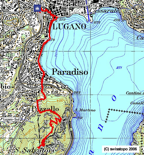 |  | Lugano Station - Paradiso - Pazzallo - Puntobelvedere - Monte San Salvatore - Gipfelrunde - Puntorosso - Pazzallo - Paradiso - Lugano Station |