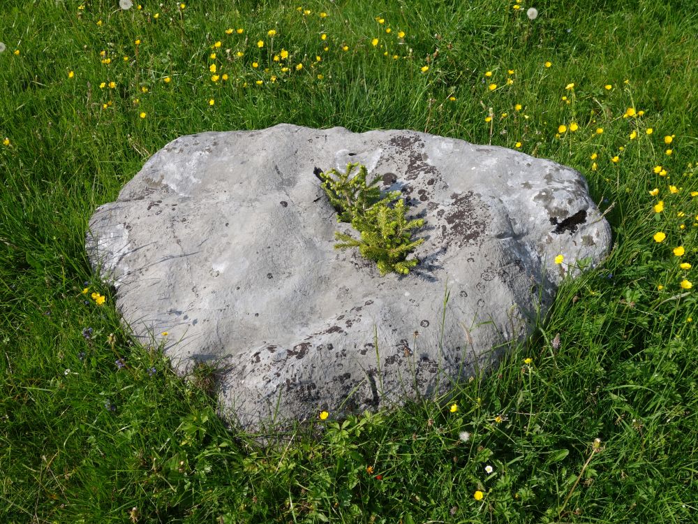 wir laufen einhundertfünfzig Meter das Zufahrtssträsschen zurück und zweigen dann nach rechts, bergwärts ab. Während wir fast einen halben Kilometer das leicht ansteigende, schmale Asphalträsschen auf den Nüenchamm zu laufen haben wir beim Zurückblicken einen herrlichen Blick über gelb blühende Wiesen hinweg zu vielen markanten Gipfeln der Glarner Alpen, wie Glärnisch, Wiggis und Rautispitz. Ein nach links abzweigender Feldweg ist als Wanderweg gekennzeichnet, aber auch gerade aus führt ein alter Pfad, den ein fremdes Wanderpärchen etwas steiler hinauf steigt. Wir entscheiden uns für den nicht ansteigenden und als Wanderweg markierten Feldweg, direkt auf einen alten Bauernhof zu. Der Bauer läuft uns entgegen und teilt uns mit, dass er gleich die Stromzuführung zum Weidezaun abschalten werde. So klettern wir am Ende des hölzernen Stallgebäudes über den nun stromlosen Weidezaun zu den gar nicht scheuen Ziegen. Schon nach ein paar Metern heisst es noch einmal Beine hoch, um wieder aus der Weide heraus zu klettern. Ein halbierter Baumstamm mit abgesägten Ästen als Stützen dient als Stufe, um besser über den Weidezaun steigen zu können. Quer zu einem steilen, bunt blühenden Wiesenhang, laufen wir dann eine Trittspur bis zum Waldrand. Durch ein Gatter betreten wir den dichten und dunklen Wald, der uns bei dem strahlenden Sonnenschein willkommenen Schatten für den Aufstieg spendet. Der bestens präparierte Waldpfad schein erst in jüngerer Zeit angelegt worden sein. Im Zickzack steigen wir fast einhundert Höhenmeter auf und stossen wieder an den Waldrand, ob der alte, auf den Karten verzeichnete Wanderweg einmündet. Ganz entspannt folgen wir dem Pfad nahezu auf einer Höhenlinie in Richtung Norden und haben gelegentlich durch eine Baumlücke freien Blick auf einzelne Gipfel der Glarner Berge. Auf einem kurzen Abschnitt ist der Pfad entlang einer senkrechten Felswand durch ein Drahtseil gesichert. An einem kleinen Tobel hat ein Wasserfall ein Erdloch ausgespült und mit Wasser gefüllt. Wir balancieren über bereitgelegte Steine am Wasserbecken vorbei. Ein verwitterter Baumstumpf mutet wie ein Wurzelmännchen an. Mit nur wenig Fantasie sind Augen, Mund und Nase zu erkennen. Vereinzelt stehen Orchideen in voller Blüte und nach einem dreiviertel Kilometer zieht uns ein heftig verästelter, uralter Nadelbaum in seinen Bann. Die extrem asymetrische Kronenform könnte darauf hin deuten, dass der Baum in der Vergangenheit durch Sturm oder Blitzschlag gekappt wurde. Von einer grösseren Lichtung aus sehen wir jetzt auch den Tödi und über den Linth-Kanal bis zum Zürichsee. Vor uns erscheinen über den Baumspitzen die ersten Berggipfel des Toggenburg, wie Speer und Mattstock. So richtig frei wird der Blick erst zwanzig Minuten später, wo wir nach einem dreiviertel Kilometer Waldpfad Im Dürren eine grössere Lichtung betreten. Nebst Linthkanal sehen wir jetzt auch zum türkisgrünen Walensee hinunter. Ein Maultier, das unter einem Baum Schatten gesucht hatte, kommt uns entgegen und will begrüsst werden. Wir bleiben auf der Höhenlinie und laufen durch meist baumfreies Gelände mit bester Aussicht etwa achthundert Meter in nordöstliche Richtung. Bei Mittlist Nüen (Mittlere Neuenalp) werden gerade Tische und Bänke für eine Einkehr der Wanderer bereit gestellt, aber für uns wäre das noch etwas früh, also laufen wir weiter Richtung Habergschwänd, das ohne Gehzeit auf dem Wanderwegweiser aufgeführt ist. Am Wirtschaftsgebäude von Mittlist Nüen vorbei, verläuft noch etwa einhundert Meter weit ein breiter Betonweg, bis zu einem länglichen Stallgebäude. Dann laufen wir ostwärts im leichten Auf und Ab durch hügeliges Gelände, aber tendenziell mehr Abwärts, und können dabei immer wieder Orchideen und kleine, bunte Blumenteppiche fotografieren. Im leichten Auf und Ab, aber tendenziell mehr Abwärts, laufen wir ostwärts durch hügeliges Gelände und können dabei immer wieder Orchideen und kleine, bunte Blumenteppiche fotografieren. Das Gelände wird etwas sumpfig, weshalb nach etwa vierhundert Metern, wo auch ein Wanderweg zum Nüenchamm abzweigt, ein langer Holzsteg auf die nassen Wiesen gelegt wurde. Weitere vierhundert Meter laufen wir bis zur Bergstation der Sesselbahn, die am Kerenzerberg von Filzbach nach Habergschwänd Wanderer, Biker und sonstige Ausflügler den Berg hinauf befördert. An einer Kuhattrappe aus Holz kann das Melken geübt werden, was prompt vom Einen oder Anderen für's Foto erfolgreich versucht wurde. Erneut verschmähen wir eine Einkehr auf die Terrasse des Berggasthauses, diesmal mit Blick auf den Walensee. Der Wanderwegweiser zeigt den Talalpsee in Richtung Asphaltsträsschen an, mit einer Gehzeit von 30 min. Laut Wanderkarte müsste ein Wanderweg oberhalb des Asphaltsträsschens verlaufen, doch eine Abzweigung bekommen wir nicht zu sehen. Deshalb laufen wir auf dem Asphalträsschen nach einer S-Kurve in einem weiten Rechtsbogen immer weiter abwärts. Nach siebenhundert Metern mündet der verpasste Wanderweg von rechts in das Asphaltsträsschen. Nach dem Rechtschwenk fällt das Asphaltsträsschen Richtung Süden ab und passiert dabei senkrechte Felswände, die auf der rechten Strassenseite fast überhängend hinauf ragen. Nach einem dreiviertel Kilometer schwenkt das Strässchen bei Talhütten in einer Haarnadelkurve um 180 Grad nach links. Wir halten uns weiter geradeaus und laufen einhundert Meter einen Schotterweg. Der Talalpsee kommt in Sicht und eine Holztafel zeigt mit einem Pfeil nach rechts die "Letzte Tankstelle vor dem See" an. Jetzt ist auch für uns die Zeit reif für eine Einkehr. Auf der gemütlichen Terrasse setzen wir uns in den Schatten von Baum und Markise und lassen es uns gut gehen. Nach der Einkehr laufen wir den Schotterweg zweihundert Meter weiter bis zur Nordspitze des Talalpsees. Hier Verlassen wir den breiten Schotterweg, der im Osten am Talalpsee entlang verläuft und begeben uns auf den schmalen Pfad entlang