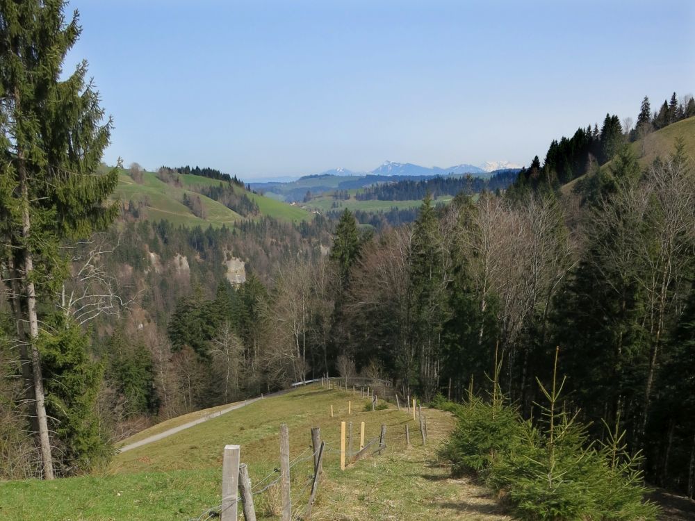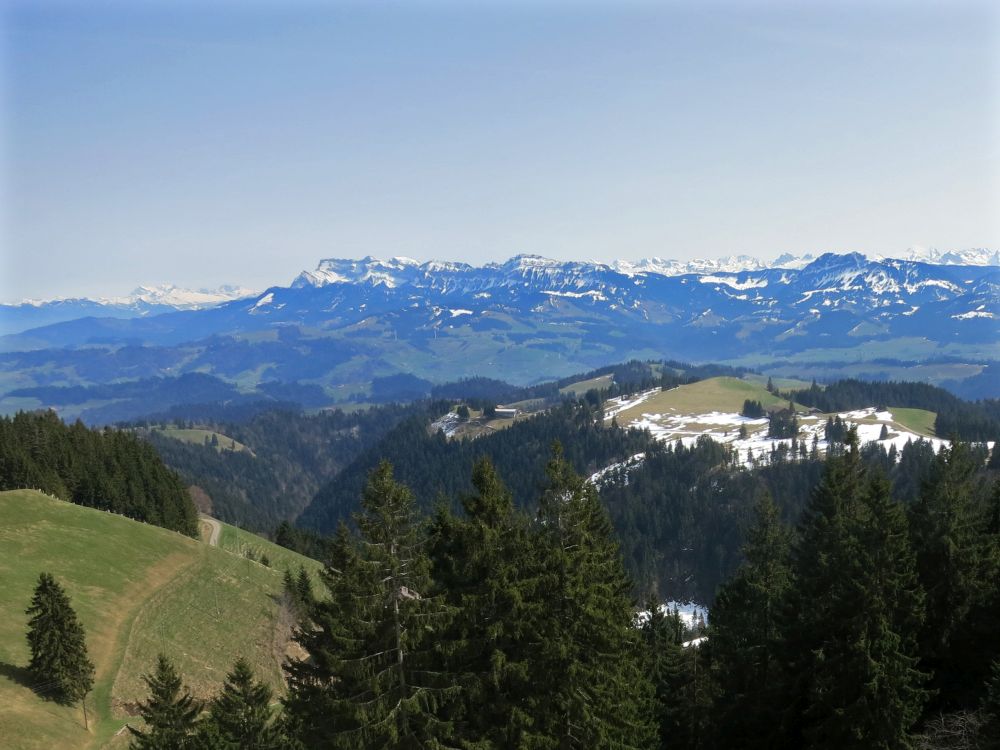 Noch bevor wir in den Ort Menzberg hinein fahren, finden wir an einer Abzweigung einen Wanderparkplatz, der für uns geeignet zu sein scheint. Am Wanderwegweiser sind die Etappenziele Oberlehn und Gmeinalp unserer Wanderung aufgeführt. Ein ansteigendes Asphaltsträsschen zweigt Richtung Westen ab.Wir laufen das Stässchen hinauf und erkennen schon nach zehn Minuten in der Ferne einige uns bekannte Berge, wie Rigi, Pilatus und andere. Auch die bekannten Berner Eiger, Mönch und Jungfrau sind schon zu sehen. Obwohl am Wanderwegweiser bis Oberlohn eine Gehzeit von zehn Minuten angeschrieben ist, passieren wir den Ort vor lauter Schauen erst nach fünfzehn Minuten. Ab Oberlohn folgen wir dem Fernwanderweg 3 mit dem wohlverdienten Namen "Alpenpanorama-Weg" in Richtung Napf. Nach etwa vierhundert Metern verlassen wir den breiten Wirtschaftsweg und laufen weglos über die Wiesen einen Grashügel hinauf, auf dem um ein Bäumchen herum für alle Richtungen Panoramatafeln aufgestellt sind. Der Grashügel heisst Oberlehnhoger und ist mit 1130 m ü M. der höchste Punkt der Gemeinde Menznau. Gleichzeitig ist der Hügel Schluss und Anfang des Fuchslochrundweges, den man in zwei Stunden laufen kann. Wir schauen uns noch ein Weilchen um und entdecken Dank Panoramatafeln auch noch den Säntis und den Uri Rotstock. Auf der anderen Seite des Hügels laufen wir die Wiesen hinunter und stossen schnell wieder auf den Wirtschaftsweg, den wir drei Minuten später nach rechts verlassen. Auf einem Waldweg kürzen wir einen Bogen des Wirtschaftsweges ab. Nach knapp fünf Minuten treffen wir wieder auf den Wirtschaftsweg, dessen beide Betonspuren aus dem Wald hinaus verlaufen und bis auf einen Wiesenhügel hinauf zu sehen sind. Wir passieren auf den Betonspuren nach fünf Minuten Oberwaldig, wo ein paar Leute auf den Bänken vor dem Haus sitzen. In einem Zwinger kläfft gleich eine ganze Horde von Hunden. Auf der sonnigen Hochebene schlängelt sich der breite Wirtschaftsweg weiter in Richtung Südwesten. Schon von Weitem sind die Gebäude von Gmeinalp zu sehen. Wir erreichen sie, ganz zuletzt wieder auf Beton, nach knapp zwanzig Minuten. An der Hauswand steht über der Bier-Werbung auf einer Tafel "Hier Getränke-Verkauf". Das geschlossene Verkaufs-Fenster wird vermutlich erst geöffnet, wenn man den Klingelknopf im Fensterrahmen drückt. Wenige Meter nach den Gebäuden von Gmeinalp reizt auf einem Grashügel ein Gipfelkreuz unter einem mächtigen Baumgerippe zu einem kurzen Abstecher. Wieder steigen wir weglos die Wiese hinauf und bestaunen den alten Baum mit seinen extrem vielen Ästchen und ohne ein einziges Blatt. Ebenso laufen wir weglos auf der anderen Seite des Hügels bis zum Weg hinunter. Der nun schmalere Fusspfad, verläuft teilweise über einen breiten Grat und ist meist mit Gras bewachsen und laubbedeckt, wo Laubbäume sind. Ein Wanderwegweiser zeigt nach einer viertel Stunde an, dass wir bei Chrotthütten sind. Die Hütte macht einen geschlossenen Eindruck. Tische und Bänke stehen zwar draussen und die Türe steht offen, aber kein Mensch ist zu sehen. Nebenan plätschert ein Brünnlein im Walde. Waren wir bisher überwiegend alleine auf dem Weg, kommen jetzt immer mehr Wanderer entgegen. Kein Wunder, ein Blick auf die genaue Karte zeigt gleich mehrere Parkplätze in unmittelbarer Nähe. Genau auf den Hengst zu, in Richtung Süden, laufen wir den schattigen Waldweg, und wundern uns zunächst darüber, dass es nicht aufwärts geht und über den Richtungswechsel, wo der Weg nach dreihundert Metern am Bach Kleine Fontannen einen Schwenk nach Nordosten macht. Doch dann verstummen die Stimmen der Mitwanderer bald, wie der Pfad über Wurzeln steil den Wald hinauf steigt. Die Sicht wird nach etwa zwanzig Minuten besser, vor allem in Richtung Osten und Norden, wo sich Rigi und Pilatus zeigen. Vor uns verdeckt der Hengst die Sicht. Einen breit planierten und teilweise schneebedeckten Schotterweg laufen wir steil Richtung Süden hinauf. Über einer senkrechten, gekrümmten Felswand sind die Gebäude von Stächelegg zu erkennen. Je mehr wir uns Stächelegg nähern, umso mehr müssen wir über Schneereste steigen. Die gekrümmte Felswand macht auf uns nun den Eindruck eines überdimensionalen, natürlichen Napfes und wir könnten uns vorstellen, dass daher der Name des benachbarten Berges stammen könnte. Kurz vor Stächelegg nähern wir uns bis auf wenige Meter der Oberkante der Felswand. Am Hauptgebäude von Stächelegg ist ein Kiosk mit allerlei Selbstgemachtem geöffnet. Auf der Sonnenseite sind zwischen Hauswand und meterhohem Misthaufen Tische und Bänke aufgestellt. Es ist ein Betrieb wie in einer Fussgängerzone, als wenn die Bergstation einer Seilbahn um die Ecke wäre. Trotzdem finden wir einen freien Tisch und geniessen bei einer Rast die herrliche Aussicht, jetzt in Richtung Süden, auf die Berner Alpen. Vor allem für Geologen muss die Umgebung eine wahre Goldgrube sein. Auf einer grossen Informationstafel sind Titel zu lesen wie "Nagelfluh - ein bunter Strauss verschiedener Gesteine aus dem Alpenraum" und "Der Napf - ein alpiner Schutthaufen". Aber auch für Nichtgeologen könnte die Umgebung zur Goldgrube werden, denn der Haupttitel der Infotafel lautet "Nagelfluh und Gold". Doch wir finden trotz Wachsamkeit den ganzen Tag kein Nugget. Nach der Rast laufen wir den breiten Wirtschaftsweg etwa zweihundert Meter ostwärts. In einer Rechtskurve zweigt nach links ein steiler Wiesenpfad ab. Dank der Kraft der Sonne bleibt es uns erspart, all zu oft den Fuss in den Schnee zu setzen. Doch wo der Hang sich auch nur leicht nach Norden neigt, ist die Schneedecke über grosse Flächen geschlossen. Nach dem kleinen Anstieg von gut vierzig Höhenmetern stehen wir am wohl höchsten Punkt unserer Wanderung. Der Wanderwegweiser zeigt eine Höhe von 1347,4 m an. Über die Hochebene von Ober Änzi hinweg sehen wir die gleichnamige Alm und dahinter einen Grashügel mit Gipfelkreuz. Wegen der fantastischen Aussicht s