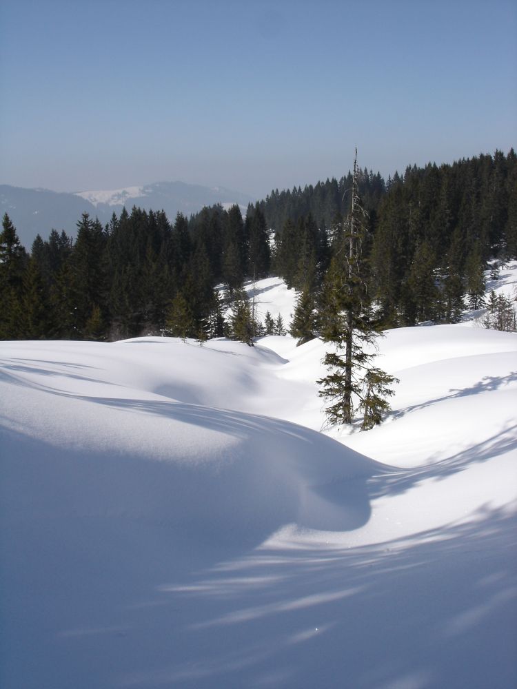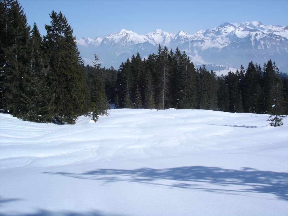 Noch in Alpthal, wenige Minuten vor dem Ausgangspunkt unserer Wanderung, lässt der Nebel die Sonne nur erahnen. Doch plötzlich tauchen die Gipfel der Mythen in strahlenden Sonnenschein vor uns auf. Auf dem Parkplatz der Skilift-Anlagen stellen wir unser Auto ab. Ausnahmsweise stören uns die Skifahrer überhaupt nicht, denn sie tummeln sich am Osthang, währen wir den Westhang erobern wollen. Die erste Orientierung ist etwas durch die meterhohen Schneeberge behindert, so fragen wir einen ortskundigen nach dem Wanderweg zum Furggelen. Mit Schneeschuhen bewaffnet führen sehr viele Wege nach oben, aber wir entscheiden uns für den beschliderten Weg. Wir sind nicht die Einzigen. Die sehr gut markierte Spur macht ein Verlaufen unmöglich. Wo keine Täfelchen im Schnee stecken ziert ein roter Bändel einen Baum oder Stauch. Lichter Wald und unzählige Lichtungen sorgen für einen sonnigen Aufstieg. Der obere Abschnitt ist fast baumfrei, so ist die Skihütte auf dem Furggelen schon von weitem zu sehen. Hier treffen sich Tourenskiläufer und Schneeschuhläufer, um auf der Terrasse das mitgebrachte Vesper, oder eine warme Summe vom Hüttenwirt, zu verspeisen.Nach einer kurzen Pause machen wir uns wieder auf den Weg in Richtung Norden. Nur noch wenige Spuren ziehen sich auf dem Kamm entlang. Die Spur, die wir verfolgen, scheint uns nicht zu unserem Ziel zu führen, da sie in Richtung Osten abdriftet. Also verlassen wir den begangenen Pfad und bahnen uns durch unberührte Schneefelder unseren eigenen Weg. Schon nach wenigen hundert Metern entdecken wir einen im Schnee versunkenen Wanderwegweiser, der die von uns eingeschlagene Richtung bestätigt. Kurz darauf treffen wir auch wieder auf eine Spur. Auf dem breiten Bergkamm geht es jetzt mal am Waldrand entlang, mal durch den Wald, mal leicht bergab, mal leicht berauf bis zur Butziflue. Seit Furggelen haben wir nur etwa 20 Höhenmeter verloren. Hier biegt der Weg ins Tal nach Alpthal ab, den wir später nehmen wollen. Zunächst steht uns noch ein Abstecher zum 100 Meter höheren Gschwändstock bevor. Recht steil geht es durch den tiefverschneiten Wald hinauf, linkerhand ständig einen steilen Abgrund vor Augen. Den Wanderwegweiser, der den Gschwändstock kennzeichnet, steht 16 Meter unterhalb der in der Wanderkarte angegebenen Höhe des Gschwändstocks. Zwei Höcker bieten sich noch zum Besteigen an. Auf den Höckern versperren nur ein paar wenige Bäume die freie Sicht auf unzählige Gipfel der Umgebung. Dach einer kurzen Fotopause treten wir den Rückweg an. Überraschend schnell sind wir an der Butziflue zurück und müssen feststellen, dass bei der aktuellen Schneelage, der Abstieg nach Alphtal noch nicht begangen wurde. Für ortsunkundige ist der Weg unter der hohen Schneedecke nicht auszumachen, zu spärlich sind die Markierungen an den Bäumen. Deshalb beschliessen wir, wieder zum Furggelen zurück zu kehren, um von dort den bekannten Weg nach Brunni abzusteigen. Ab Furggelen schliessen wir uns einer ortskundigen, jungen Gruppe von Schneeschuhwanderern an. So jagen wir in einem flotten Tempo durch den unberührten Wald ca. 400 Höhenmeter hinunter nach Brunni. | ||||