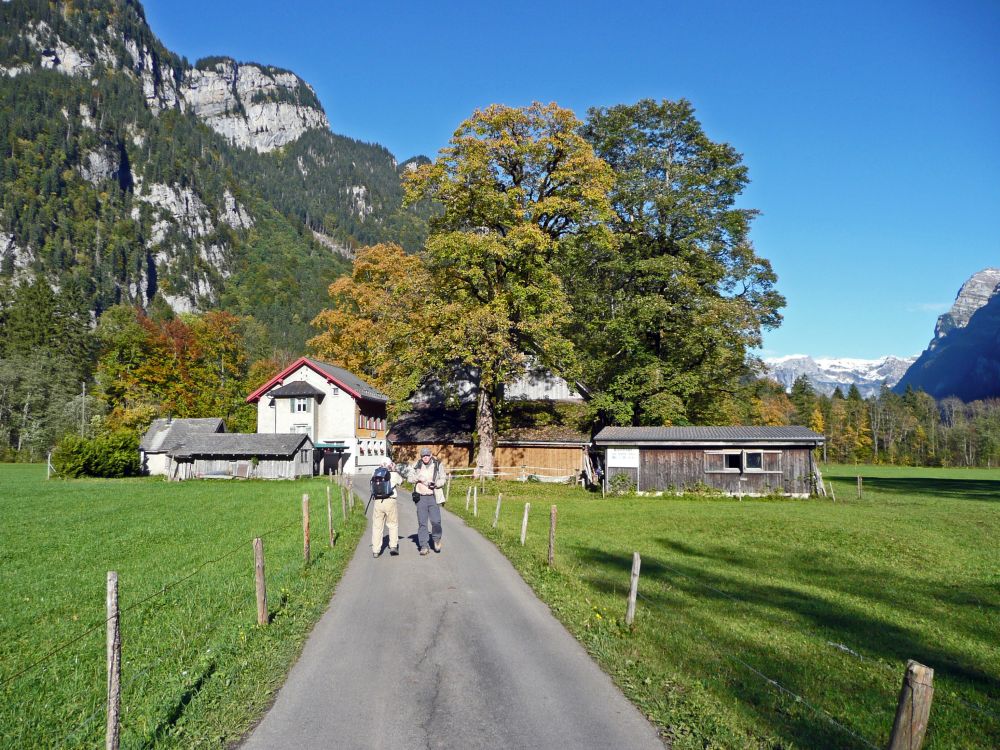 Am Westufer des Klöntaler See fahren wir über die Staumauer und folgen dem Hinweisschild zu einen Waldparkplatz in der Nähe des Campingplatzes Güntelnau. Wir sind nicht böse, dass die Zentrale Parkuhr die Annahme einer Parkgebühr verweigert, denn sie ist schon winterfest verpackt und mit der Aufschrift "Parkuhr ausser Betrieb" versehen.Während wir über die Staumauer zurück nach Rhodannenberg laufen, bieten sich schon unzählige Fotomotive an, geknipst zu werden. In der stillen Wasseroberfläche des Klöntaler See spiegelt sich alles, was sich auf und am See befindet. Die Fastdreitausender des Glärnisch, dessen Nordwände das Ufer des Klöntaler See berühren, verhindern im Moment, dass der See Sonnenstrahlen abbekommt. Etwa einen Kilometer laufen wir von Rhodannenberg die schmale Fahrstrasse am Nordufer des Sees entlang, bis laut Wanderkarte auf der rechten Seite ein Wanderweg abzweigen soll. Vergeblich trachten wir nach Wanderwegweiser, die vielleicht jahreszeitbedingt bereits abmontiert wurden. Auf Verdacht zweigen wir auf einen unbeschrifteten Pfad ab, sehen aber bald eine blasse Wegmarkierung an einem Baum. Schon wenige Minuten später finden wir einen anständigen Wanderwegweiser, der uns die Richtung zur Dejenalp anzeigt. Anfangs muss man genau hinschauen, um den Pfad über den Wiesenhang nicht zu verlieren. Mit zunehmender Höhe wird der Pfad ausgetretener und breiter. Durch ein Waldstück sind mit Holzbalken künstliche Tritte angelegt. Nach einer Stunde passieren wir eine kleine Hütte, auf deren Terrasse mit Seesicht gerade gefrühstückt wird. Kurz darauf taucht der Wanderweg wieder in den Wald ein. Endlos lange Treppen führen nach oben. Und denkt man, oben angekommen zu sein, geht es nach einem Bogen genauso endlos wieder weiter. Schliesslich scheint die Waldgrenze erreicht zu sein. Ein paar herbstliche Laubbäume bilden einen tollen Farbkontrast zum blauen Himmel. Der Wanderweg führt jetzt über Schotterfelder, mal auf den Dejenstock zu, mal auf den Mättlistock zu. Eine kleine Ecke des mehr als 600m tieferen Klöntaler See wird jetzt von der Sonne angestrahlt und leuchtet türkisgrün. Wir passieren nach einer weiteren Stunde die Alm Lochstafel. Vom höchsten Punkt unserer Wanderung trennen uns noch gute 200 Höhenmeter, für die wir eine knappe halbe Stunde benötigen. Von der Passhöhe sehen wir in ein Tal, das sich vom Dejenpass bis ins Hintere Klöntal hinunter zieht. Im Rücken sind Glärnisch und Vorder Glärnisch immer noch im Gegenlicht zu sehen, schon während des gesamten Aufstiegs. Rechts und links ragen die spitzigen Gipfel von Dejenstock und Mättlistock in den Himmel. Da es von nun an nur noch bergab geht, legen wir erst mal eine Rast ein. Die Fotografen mit den Hummeln im Hintern erkunden die nähere Umgebung. Zu bewundern gibt es jede Menge Karstgestein mit tiefen Spalten und viele Heidelbeersträucher. Im durchgeschwitzten Hemd kommen wir beim leichten Wind schnell ins Frösteln, so dass wir die Rast bald wieder beenden. Im Tal unter Lachengrat und Chrutlen sehen wir den Wanderweg ganz deutlich. Es ist die weisse Linie, die der letzte Schneefall gezeichnet hat. Wir steigen ins Tal hinunter und bleiben ein paar Meter unter dem Wanderweg, da Schneestapfen so anstrengend ist. Doch auch in den wassergetränkten Wiesen wird das Gehtempo stark abgebremst. So benötigen wir anderthalb Stunden, das sanft abfallende Tal hinunter, bis zur Alm Längenegg. Kurz vor der Alm verführt uns ein Wasserfall zu einem kleinen Abstecher. Neben den steilen Wänden des Mieserenstock haben wir nun auch freie Sicht auf den Silberen. Dazwischen liegt das Pragelpass. Auf einem breiten Wirtschaftsweg geht es jetzt in vielen Kehren, von denen sich manche über steile Wiesen abkürzen lassen, vorbei an den Almen Chängel, Ratlis und Ralli, über 500 Höhenmeter und ca. 5 km bis Schwändeli, einer Bushaltestelle an der Autostrasse zwischen Klöntaler See und Pragelpass. Unterwegs fotografieren wir die weissen Südwände von Mutteristock und Ochsenkopf, die gelben Laubbäume, die sich farblich fantastisch vom stahlblauen Himmel abheben, die schneebedeckten Gipfel und Nordhänge des Glärnisch und schliesslich den türkisfarbenen Westzipfel des Klöntaler See. Inklusive kleiner Trinkpause bei der Alm Ratlis sind wir von Längenegg bis Schwändeli anderthalb Stunden unterwegs. Zwei Kehren der Fahrstrasse lassen sich auf dem offiziellen Wanderweg abkürzen, doch dann müssen wir etwa einen Kilometer auf dem Strässchen in Richtung Klöntaler See zu laufen. Nur selten kommt ein Auto, dank geringer Strassenbreite mit gemässigtem Tempo. Dann zweigt rechterhand ein Pfad von der Strasse ab, der uns geradewegs auf eine kleine Kirche zu führt. Ein mehrstöckiges Haus mit Holzverkleidung und grünen, geschlossenen Fensterläden scheint Winterschlaf zu halten oder ist vielleicht sogar schon im Altersruhestand. Der Pfad biegt an diesem Haus nach rechts ab und verliert sich auf einer Wiese. Doch das Gasthaus Klöntal ist bereits in Sicht. Grosse Laubbäume mit goldgelben Blättern bilden ein Dach über der Gartenterrasse, auf der wir es uns mit Bier und grossen Eisbechern gut gehen lassen. Ein Wanderwegweiser zeigt für den Weg nach Rhodannenberg entlang des Südufers vom Klöntaler See eine Gehzeit von eindreiviertel Stunden an. Jetzt zeigt sich wieder einmal der Unterschied zwischen Mann und Frau. Während das eine Geschlecht für den Rückweg den überfüllten Postbus wählt, geniessen die Anderen wohl den schönsten Abschnitt der Wanderung. Nach ein paar Metern auf einem Asphaltsträsschen zweigt nach links ein Schotterweg ab, der wenige Meter später, am Steppelwald, in einen Pfad über geht. Durch den Wald nähern wir uns dem Südufer des Klöntaler See. Die gegenüberliegende Seeseite wird noch von der Sonne beschienen und in der stillen Wasseroberfläche spiegeln sich die weissen Felsen, grünen Tannenbäume und herbstlich bunten Laubbäume. Immer wieder ist ein kleiner Wegabschni