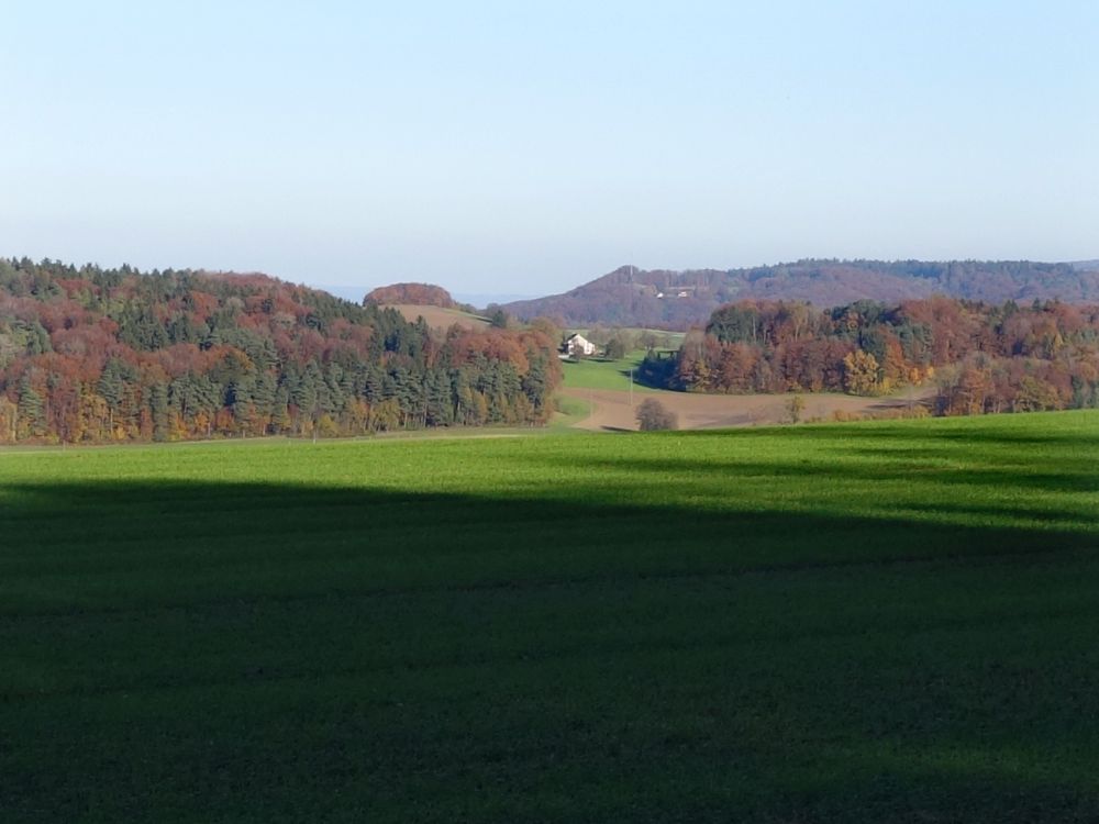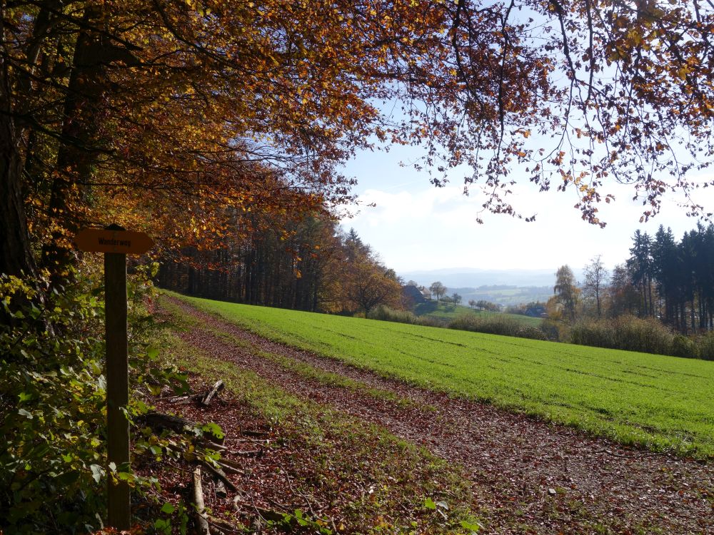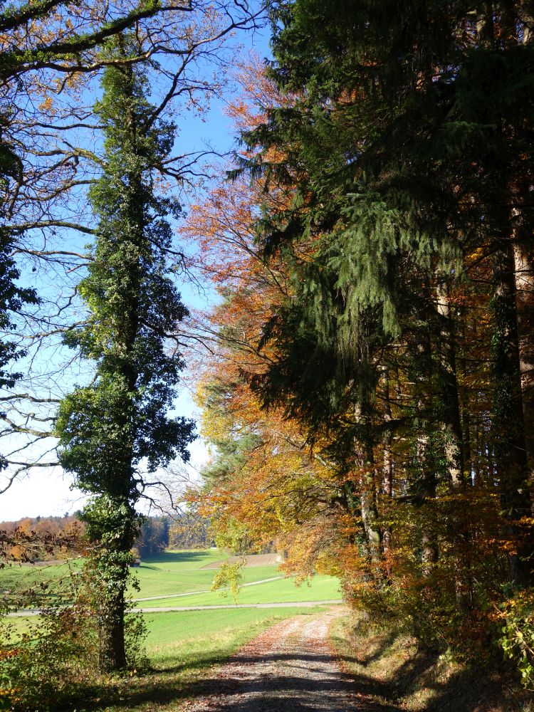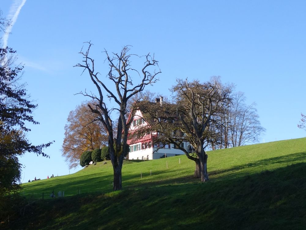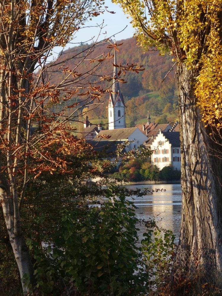 Auf der anderen Seite der Unterführung verläuft die Strasse einen halben Kilometer in Richtung Süden und macht dann einen Linksknick. An der Ecke, an die Strasse nach weiteren achtzig Metern in die Gemeindestrasse nach Etzwilen mündet, gibt es in einem Schaufenster Modelleisenbahnen in verschiedenen Massstäben zu bestaunen. Dann begleitet der Wanderweg die Strasse nach Etzwilen auf eine Länge von zweihundertfünfzig Metern in Richtung Süden. Vom Rechtsknick der Autostrasse zweigt der Wanderweg geradeaus ab. Ein schmaler werdender Pfad steigt durch dichtes Gebüsch an, während ein Asphaltsträsschen im weiten Bogen westwärts den Anstieg überwindet. Ein umgestürzter Baum ist nur in sehr gebückter Haltung zu unterqueren. Nach gut zweihundert Metern mündet der Pfad im freien Gelände in das Asphaltsträsschen. Kerzengerade steuert das Strässchen auf den dreihundertfünfzig Meter entfernten Ferienpark Chämi-Hütte zu, der auf der Karte als Campingplatz eingezeichnet ist. Zelte sind allerdings keine zu sehen, allerhöchstens mal ein Vorzelt vor einem der fest installierten Häuschen. Der Ferienpark liegt am Hang und das Strässchen umgeht die Anlage im Uhrzeigersinn. Kurvenreich steigt das Strässchen den nächsten Kilomenter etwa fünfzig Höhenmeter an. Der Nebel löst sich langsam auf. Unter der Nebeldecke kommen die Häuser von Stein am Rhein zum Vorschein. Über dem Nebel lugt das Schloss Hohenklingen vom Schiener Berg hervor. Am Waldrand, gleich nach dem Speckhof, einem Bauernhof mit eigener Ortstafel, gibt ein Wanderwegweiser die weitere Richtung an. Laut Wanderkarte sollte der Wanderweg dem Asphaltsträsschen folgen, das nun rechterhand im Wald verschwindet. Der Wanderwegweiser zeigt aber nach links, vom Asphaltsträsschen weg, Nussbaumen mit einer Gehzeit von 35 min an. Auf einem weiteren Wegweiser steht "neue Wegführung". Die neue Wegführung leitet auf einem laubbedeckten Fortsweg einen halben Kilometer meist aufwärts in Richtung Süden. An einer grösseren Lichtung hat man in einiger Distanz den Rappenhof vor Augen, auf den der Fortsweg entlang des herbstlich bunten Waldrandes hin führt. Der Wanderweg zweigt aber nach rechts ab, ebenfalls entlang eines herbstlich bunten Waldrandes, macht nach dreihundert Metern einen Linksbogen und taucht nach weiteren hundert Metern rechts in den Wald ein. Mit gelegentlichen Richtungswechseln verläuft nun der Wanderweg, von einem kleinen Verbindungsstück abgesehen, auf breiten Forstwegen etwa einen Kilometer in südwestliche Richtung. Dann macht er einen Rechtsbogen und mündet ausserhalb des Waldes nach zweihundert Metern in das Asphaltsträsschen am Ortsrand von Nussbaumen. Im Wald waren zwar keine Wildscheine anzutreffen, aber bei den ersten Häusern von Nussbaumen sind in einem Gehege Hängebauchschweine dabei zu beobachten, wie sie mit ihrer Schnauze im aufgelockerten Erdboden wühlen. Durch die Reihen von Weinrebenstöcken kann man weit unten einen kleinen Ausschnitt des Nussbommersees blitzen sehen. Am Rande der Ortsstrasse geht es nun an Weinbergen entlang steil hinab, zum Ortskern von Nussbaumen. Vorbei an der Kapelle steigt man, vom oberen Ortsrand gemessen, mehr als fünfzig Höhenmeter und einen knappen Kilometer zum Ortskern hinab, wo an einer Fassade unverkennbar das Wappen des Ortes zu sehen ist. In verschiedenen Richtungen zeigt ein Wanderwegweiser Ziele an. Zum Schloss Steinegg ist nach links eine Gehzeit von 45 Min. angeschrieben. Nun geht es steil südostwärts das Dorfsträsschen zum Katrinebärg hinauf, wo aus dem Stallfenster eines grossen Bauernhofes (wie immer) neugierig ein Pferd heraus schaut. Vom Katrinebärg sieht man auch zu dem Ortsteil hinüber, wo man noch vor kurzem entlang der Weinreben zum Ortskern hinunter gelaufen ist. Im Süden sind nun neben dem Nussbommersee auch Hüttwilersee und Hasesee zu sehen, und bei guter Fernsicht auch die Alpen. Von den letzten Häusern Nussbaumens läuft man etwa achthundert Meter auf einem breiten Wirtschaftsweg ostwärts. Parallel dazu verläuft in einiger Distanz ein Asphaltsträsschen, das Staanegg (Steinegg) mit Nussbaumen verbindet. Über die Wiesen hinweg sieht man im Hintergrund schon ein Türmchen von Schloss Steinegg. Vom Wirtschaftsweg zweigt schliesslich ein Pfad ab, der laubbedeckt im bunten Herbstwald immer schmaler wird. Nach etwa zweihundert Meter erkennt man linkerhand durch eine kurze Waldschneise den kleinen Staanegger Weiher. Man kann sich durch die Schneise fünfzig Meter dem Weiher nähern, dort den Wirtschaftsweg, in einiger Distanz zum Ufer, hundert Meter weiter laufen, und dann wieder nach rechts durch den Wald zum offiziellen Pfad zurück kehren. Fast einen dreiviertel Kilometer nach dem Weiher trifft man mitten im Wald einen Wanderwegweiser mit der Aufschrift Schloss Steinegg, und weit und breit ist kein Schloss zu sehen. Läuft man nun geradeaus weiter, steigt man irgendwann über Staanegger Tobel in Richtung Süden ab. Nach links führt der Pfad über die Wiesen hinauf, zum zweihundert Meter entfernten Strässchen, auf dem Schloss Steinegg von Nussbaumen her zu erreichen ist. Auf dem Strässchen passiert man nach dreihundert Metern das malerische Schloss, hoch über dem Staanegger Tobel. Leider ist das Schloss in privaten Händen und kann nicht besichtigt werden. Es wurde im Jahre 2009 von einem englischen Ehepaar aus Singapur erworben und wird gerade renoviert. Dabei wurden einige Anbauten aus jüngerer Zeit abgerissen. Es lohnt sich aber, ein paar Meter das Strässchen in Richtung Süden hinunter zu laufen, um die Fassade des Schlosses und die Türmchen wenigstens von aussen zu besichtigen. Nach dem Schloss macht das Strässchen bei den Häusern von Staanegg einen Bogen in Richtung Norden und taucht nach knapp zweihundert Metern in den Wald ein. Ein Wanderwegweiser zeigt Stein am Rhein mit einer Gehzeit mit 1 Std. 15 Min. an, mit dem Zusatz "nächste Abzweigung rechts". Keine fünfzig Meter sind es bis da hin, wo ein Forstweg vom A