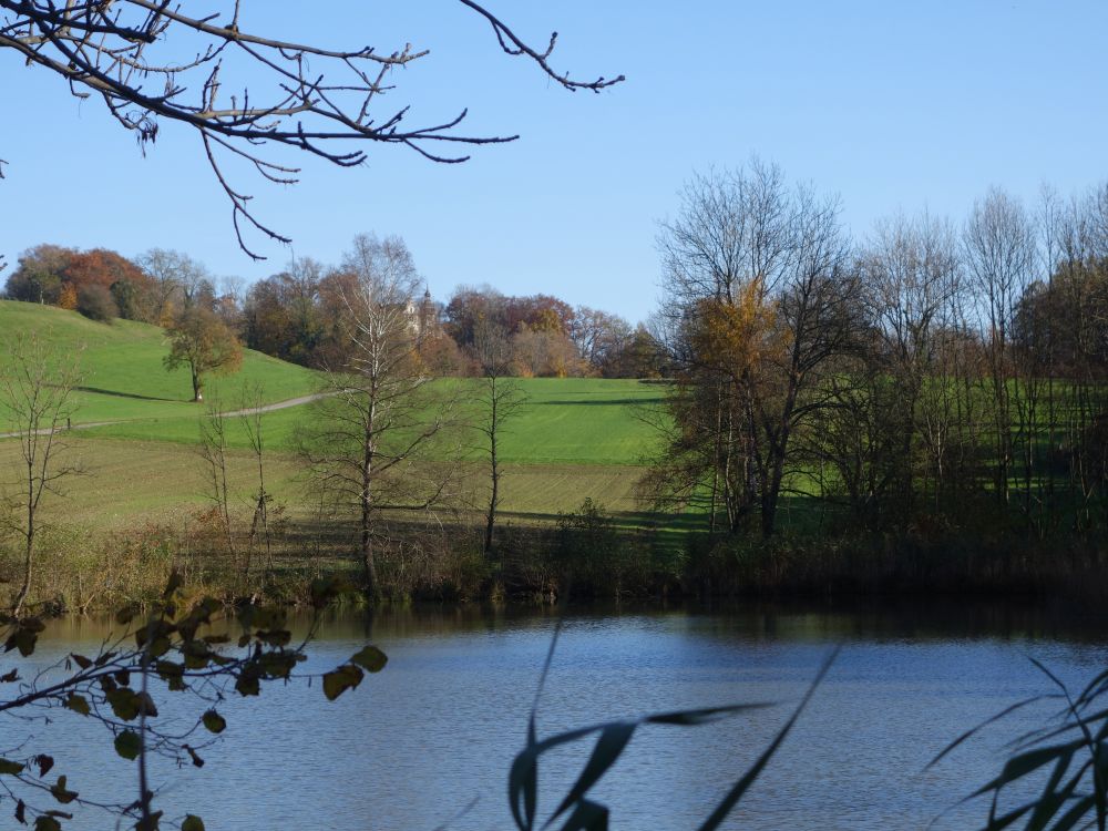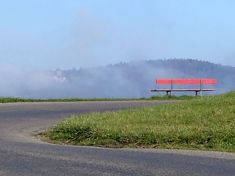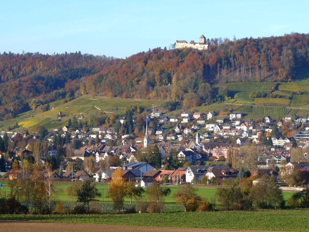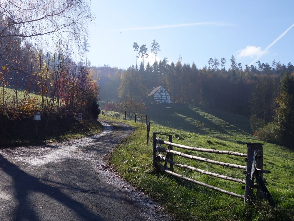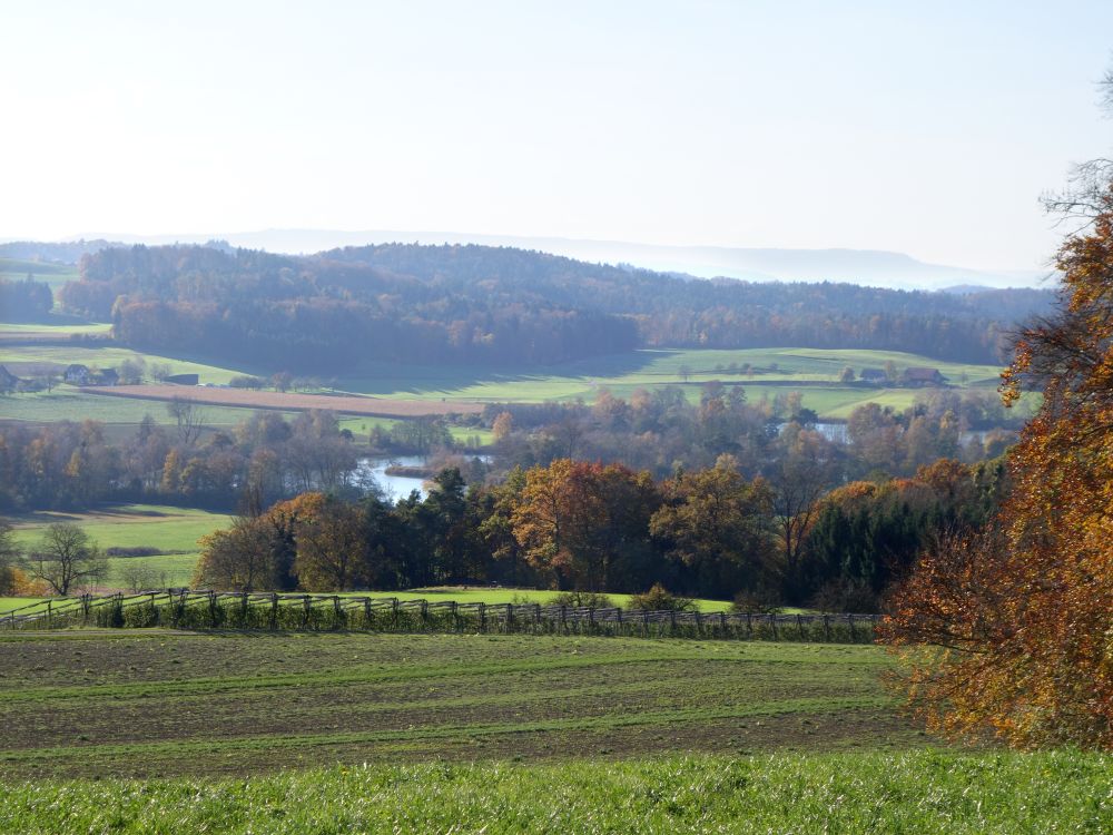 Auf der anderen Seite der Unterführung verläuft die Strasse einen halben Kilometer in Richtung Süden und macht dann einen Linksknick. An der Ecke, an die Strasse nach weiteren achtzig Metern in die Gemeindestrasse nach Etzwilen mündet, gibt es in einem Schaufenster Modelleisenbahnen in verschiedenen Massstäben zu bestaunen. Dann begleitet der Wanderweg die Strasse nach Etzwilen auf eine Länge von zweihundertfünfzig Metern in Richtung Süden. Vom Rechtsknick der Autostrasse zweigt der Wanderweg geradeaus ab. Ein schmaler werdender Pfad steigt durch dichtes Gebüsch an, während ein Asphaltsträsschen im weiten Bogen westwärts den Anstieg überwindet. Ein umgestürzter Baum ist nur in sehr gebückter Haltung zu unterqueren. Nach gut zweihundert Metern mündet der Pfad im freien Gelände in das Asphaltsträsschen. Kerzengerade steuert das Strässchen auf den dreihundertfünfzig Meter entfernten Ferienpark Chämi-Hütte zu, der auf der Karte als Campingplatz eingezeichnet ist. Zelte sind allerdings keine zu sehen, allerhöchstens mal ein Vorzelt vor einem der fest installierten Häuschen. Der Ferienpark liegt am Hang und das Strässchen umgeht die Anlage im Uhrzeigersinn. Kurvenreich steigt das Strässchen den nächsten Kilomenter etwa fünfzig Höhenmeter an. Der Nebel löst sich langsam auf. Unter der Nebeldecke kommen die Häuser von Stein am Rhein zum Vorschein. Über dem Nebel lugt das Schloss Hohenklingen vom Schiener Berg hervor. Am Waldrand, gleich nach dem Speckhof, einem Bauernhof mit eigener Ortstafel, gibt ein Wanderwegweiser die weitere Richtung an. Laut Wanderkarte sollte der Wanderweg dem Asphaltsträsschen folgen, das nun rechterhand im Wald verschwindet. Der Wanderwegweiser zeigt aber nach links, vom Asphaltsträsschen weg, Nussbaumen mit einer Gehzeit von 35 min an. Auf einem weiteren Wegweiser steht "neue Wegführung". Die neue Wegführung leitet auf einem laubbedeckten Fortsweg einen halben Kilometer meist aufwärts in Richtung Süden. An einer grösseren Lichtung hat man in einiger Distanz den Rappenhof vor Augen, auf den der Fortsweg entlang des herbstlich bunten Waldrandes hin führt. Der Wanderweg zweigt aber nach rechts ab, ebenfalls entlang eines herbstlich bunten Waldrandes, macht nach dreihundert Metern einen Linksbogen und taucht nach weiteren hundert Metern rechts in den Wald ein. Mit gelegentlichen Richtungswechseln verläuft nun der Wanderweg, von einem kleinen Verbindungsstück abgesehen, auf breiten Forstwegen etwa einen Kilometer in südwestliche Richtung. Dann macht er einen Rechtsbogen und mündet ausserhalb des Waldes nach zweihundert Metern in das Asphaltsträsschen am Ortsrand von Nussbaumen. Im Wald waren zwar keine Wildscheine anzutreffen, aber bei den ersten Häusern von Nussbaumen sind in einem Gehege Hängebauchschweine dabei zu beobachten, wie sie mit ihrer Schnauze im aufgelockerten Erdboden wühlen. Durch die Reihen von Weinrebenstöcken kann man weit unten einen kleinen Ausschnitt des Nussbommersees blitzen sehen. Am Rande der Ortsstrasse geht es nun an Weinbergen entlang steil hinab, zum Ortskern von Nussbaumen. Vorbei an der Kapelle steigt man, vom oberen Ortsrand gemessen, mehr als fünfzig Höhenmeter und einen knappen Kilometer zum Ortskern hinab, wo an einer Fassade unverkennbar das Wappen des Ortes zu sehen ist. In verschiedenen Richtungen zeigt ein Wanderwegweiser Ziele an. Zum Schloss Steinegg ist nach links eine Gehzeit von 45 Min. angeschrieben. Nun geht es steil südostwärts das Dorfsträsschen zum Katrinebärg hinauf, wo aus dem Stallfenster eines grossen Bauernhofes (wie immer) neugierig ein Pferd heraus schaut. Vom Katrinebärg sieht man auch zu dem Ortsteil hinüber, wo man noch vor kurzem entlang der Weinreben zum Ortskern hinunter gelaufen ist. Im Süden sind nun neben dem Nussbommersee auch Hüttwilersee und Hasesee zu sehen, und bei guter Fernsicht auch die Alpen. Von den letzten Häusern Nussbaumens läuft man etwa achthundert Meter auf einem breiten Wirtschaftsweg ostwärts. Parallel dazu verläuft in einiger Distanz ein Asphaltsträsschen, das Staanegg (Steinegg) mit Nussbaumen verbindet. Über die Wiesen hinweg sieht man im Hintergrund schon ein Türmchen von Schloss Steinegg. Vom Wirtschaftsweg zweigt schliesslich ein Pfad ab, der laubbedeckt im bunten Herbstwald immer schmaler wird. Nach etwa zweihundert Meter erkennt man linkerhand durch eine kurze Waldschneise den kleinen Staanegger Weiher. Man kann sich durch die Schneise fünfzig Meter dem Weiher nähern, dort den Wirtschaftsweg, in einiger Distanz zum Ufer, hundert Meter weiter laufen, und dann wieder nach rechts durch den Wald zum offiziellen Pfad zurück kehren. Fast einen dreiviertel Kilometer nach dem Weiher trifft man mitten im Wald einen Wanderwegweiser mit der Aufschrift Schloss Steinegg, und weit und breit ist kein Schloss zu sehen. Läuft man nun geradeaus weiter, steigt man irgendwann über Staanegger Tobel in Richtung Süden ab. Nach links führt der Pfad über die Wiesen hinauf, zum zweihundert Meter entfernten Strässchen, auf dem Schloss Steinegg von Nussbaumen her zu erreichen ist. Auf dem Strässchen passiert man nach dreihundert Metern das malerische Schloss, hoch über dem Staanegger Tobel. Leider ist das Schloss in privaten Händen und kann nicht besichtigt werden. Es wurde im Jahre 2009 von einem englischen Ehepaar aus Singapur erworben und wird gerade renoviert. Dabei wurden einige Anbauten aus jüngerer Zeit abgerissen. Es lohnt sich aber, ein paar Meter das Strässchen in Richtung Süden hinunter zu laufen, um die Fassade des Schlosses und die Türmchen wenigstens von aussen zu besichtigen. Nach dem Schloss macht das Strässchen bei den Häusern von Staanegg einen Bogen in Richtung Norden und taucht nach knapp zweihundert Metern in den Wald ein. Ein Wanderwegweiser zeigt Stein am Rhein mit einer Gehzeit mit 1 Std. 15 Min. an, mit dem Zusatz "nächste Abzweigung rechts". Keine fünfzig Meter sind es bis da hin, wo ein Forstweg vom A
