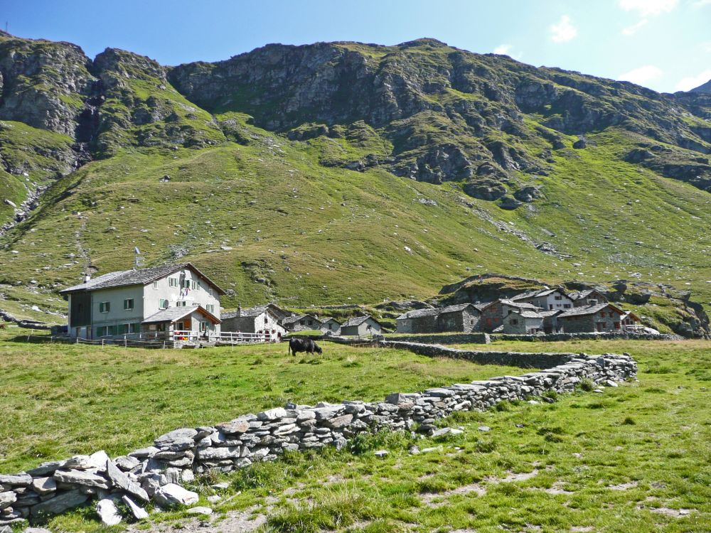 In Fraciscio, auf fast 1300m ü.d.M., beginnt unsere Wanderung. In ein paar Serpentinen laufen wir durch den Ort aufwärts und wundern uns über Grösse und passablen Zustand der Häuser, da die Zufahrt über das kurvige Bergsträsschen eher ein ärmliches Bergdorf erwarten lässt. Schon am Ortsausgang endet das Asphaltsträsschen und wir müssen uns mit einem miserablen Schotterweg begnügen.Der Schotterweg geht dann bald in einen schmalen Bergpfad über, der durch viel zu hohe Treppenstufen aus Naturstein für ordentlichen Höhengewinn sorgt. Der Wasserfall, der vor unseren Augen in die Tiefe stürzt, bekommt wegen des Gegenlichts und des steilen Abgrundes am Wegesrand zu wenig Beachtung. Nach knapp zwei Stunden erreichen wir unser erstes Etappenziel, das Rifugio Chiavenna im Bergdorf Angeloga. Die idyllische Siedlung liegt auf eine grünen Hochebene, am kleinen See L. di Angeloga. Auf der Terrasse geniessen wir unser erstes Bier, während wir auf unsere Nachzügler warten. Für einen Teil der Wandergruppe ist hier schon Endstation, sie wollen lieber relaxen. So macht sich eine Untergruppe auf den Weiterweg, noch einmal 300 Höhenmeter hinauf, zu weiteren Seen. Unmittelbar nach Angeloga steigt der Zickzackweg steil an und wird noch steiler. Da hilft nur vorausblicken und weiterlaufen. Im oberen Bereich bieten ein paar Drahtseile zusätzliche Sicherheit, für den, der es braucht. Nach 35 Minuten tauch der kleine See L. Nero vor uns auf. Die nächste Hochebene ist erreicht. Wir folgen dem Pfad am nördlichen Ufer entlang und stossen bald auf den nächsten kleineren See. Berggipfel spiegeln sich in der stillen Wasseroberfläche. Durch ein Labyrinth von Feldbrocken schlängelt sich der Pfad weiter in Richtung Nordosten, an so manchem weiteren Tümpel vorbei. Eine letzte Linkskurve und der langgestreckte Stausee Lago di Lei taucht unter uns auf. Der Anblick dieses 8 km langen Stausees ist das Ziel unserer Wanderung. An einem windgeschützten Plätzchen setzen wir uns zu einer Vesperpause ins Gras. Auf dem Rückweg wollen wir die Seen um den Pso di Angeloga von der südlichen Seite umrunden. Dazu müssen wir aber die Abzweigung in Passnähe erwischen. Eine Beschilderung gibt es nicht. Ein Mitwanderer macht rechtzeitig auf ein Steinmännchen aufmerksam. Dann finden wir auch einen Stein, auf den in roter Farbe zwei Richtungen zum Rif. Chiavenna aufgezeichnet sind. Wir zweigen nach links ab und folgen der spärlichen Trittspur. Ab und zu ist eine verwaschene Markierung auf einem Stein zu sehen. Durch ein Felslabyrinth steigen wir zunächst unerheblich auf und haben von dort einen Überblick über die Seen L. Caldera und L. Nero. Weiter geht es in Richtung Süden und dann abwärts nach Nordost drehend, bis wir schliesslich nach anderthalb Stunden wieder in Angeloga landen. Viele Varianten, um von Angeloga nach Fraciscio zu gelangen, gibt es nicht. So wählen wir für den Abstieg zum Ausgangspunkt der Wanderung den gleichen Weg, den wir gekommen waren. Trotz zusätzlicher Besichtigung des Kriegerdenkmals auf einem Fels bei Angeloga benötigen wir für den Abstieg eine halbe Stunde weniger, als für den Aufstieg (1h20). | ||||||||||||||