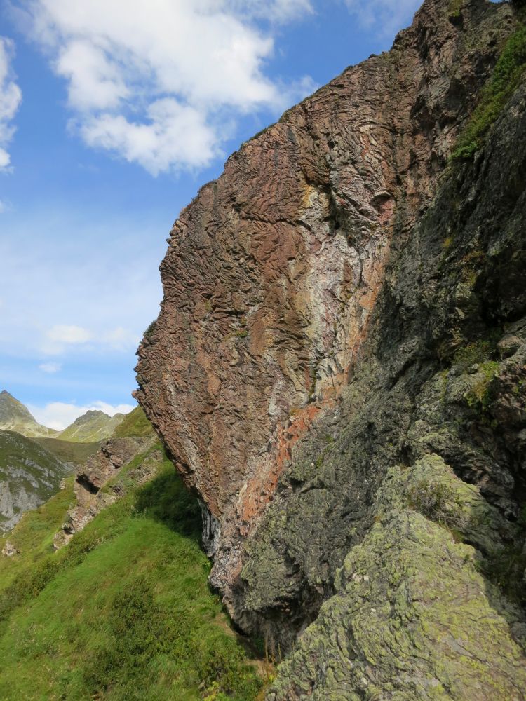 Parkflächen gibt es jede Menge, zwischen St. Antönien und Partnun, aber nicht ohne Parkautomaten. Konnte man früher noch bis Partnun (1763m), zum Parkplatz Nr. 7 fahren, ist jetzt Schluss bei Parkplatz Nr. 6, etwa 150 Höhenmeter tiefer, in der Nähe von Untersäss. Das verlängert die Gehzeit um eine ganze Stunde.Nach dem Einwurf von 3,00 Schweizerfranken würde uns die angezeigte Parkdauer ausreichen, doch zu entrichten ist ein Mindestbetrag von 6,00 Schweizerfranken. Dafür dürfen wir nun 24 Stunden parken. Aber wollen wir das? Während der Parkplatz noch im Schatten der Berge liegt, leuchten die grünen Wiesen in der Höhe schon in der Sonne und über den Wiesen lugt das hell strahlende Felsmassiv der Sulzfluh wie ein Fremdkörper hervor. Das einzige Wölkchen, das am blauen Himmel zu sehen ist, klebt am Gipfel der Sulzfluh. Auf dem leicht ansteigenden Asphaltsträsschen laufen wir nordwärts auf Partnun zu, wo wir ein anders Felsmassiv vor Augen haben, die schattige Südwestwand der Schijenflue. Nach fünfzehn Minuten gabelt sich das Strässchen. Die anderen Wanderer laufen geradeaus weiter, wohl auf oder um die Sulzfluh. Wir folgen dem Rechtsbogen und bleiben somit zunächst am Ufer des Tälli Baches. Nach dreihundert Metern kehrt die Richtung in einer Haarnadelkurve nach links und nach zweihundert Metern wieder nach rechts. Doch auf der linken Strassenseite geht am Wiesenhang ein schmaler Trampelpfad ab. Wir steigen über den Weidezaun und folgen dem Pfad die Wiesen hinauf. Nach drei Minuten passieren wir eine gekippte Holztafel mit der Aufschrift "Fussweg", die wir wieder in die Vertikale rücken. Noch einmal drei Minuten später mündet der Wiesenpfad bei einem Wanderwegweiser wieder in das Asphaltsträsschen. Der Rotspitz ist mit einer Gehzeit angeschrieben, die für uns aber nicht massgebend ist, da wir in entgegengesetzter Richtung laufen. Kurz darauf passieren wir das Berghaus Sulzfluh, dessen Terrasse wir am Ende unserer Tour mit Sicherheit einen Besuch abstatten werden. In östliche Richtung verlassen wir die Häuser von Partnun auf einem Wirtschaftsweg, der nach zehn Minuten den Tälli Bach tangiert. Ein Pfad zweigt nach rechts vom Wirtschaftsweg ab und quert über einen Holzsteg den Tälli Bach. Dann scheint sich der Pfad im grünen Hang zu verlaufen. Rote Markierungen auf den Steinen geben die Richtung an, die wir den mit Sträuchern bewachsenen Hang hinauf steigen. Mächtig erheben sich die steilen Felswände der Sulzfluh über den Häusern von Partnun, die in der Tiefe immer kleiner werden. Am Fusse der Sulzfluh ist nun auch die Carschinahütte (SAC) zu sehen, die wir von einer früheren Wanderung her kennen. In einer knappen halben Stunde gewinnen wir nahezu zweihundert Höhenmeter und haben dann freies Gelände vor uns. Fast auf einer Höhenlinie queren wir den Weidehang und blicken dabei meist auf St. Antönien und den Berg Namens Chrüz. Sind anfänglich im feuchten Gelände noch Andeutungen von Pfaden zu vermuten, ist es später auf den frisch gemähten Wiesen ganz aus mit Spuren. Dafür stecken in überschaubarem Abstand hohe Pfosten mit rotweissen Täfelchen im Gelände. Was von weitem wie ein vergessener Rucksack aussieht, entpuppt sich beim Näherkommen als schlafender Wanderer. Die Route kreuzt einen ganz neuen, in keiner Karte eingezeichneten, Wirtschaftsweg. Das letzte Baugerät, ein kleiner Bagger, steht noch vor Ort. Wir halten uns an die Markierungen in der Wiese und queren diese südwärts, wo nach wenigen hundert Metern ein breiterer Pfad immer mehr nach unten führt. Wir blicken weit hinunter in das Tal, durch das der Gafier Bach fliesst, ohne zu wissen, dass wir dort schon mal unterwegs waren. Ein Blick auf das Display des Smart Phone wird nun zum Verhängnis. Die tatsächliche Route weicht laut Anzeige stark von der geplanten Route ab. So gewinnen wir den Eindruck, zu weit abgestiegen zu sein. Deshalb steigen wir weglos die steilen Wiesen hinauf. Nach sehr anstrengenden hundert Höhenmetern stossen wir auf ein Betonsträsschen, dem wir ungefähr dreihundert Meter ostwärts folgen, laufen dann über die Wiesen zu einer Dreiergruppe von Holzhütten hinunter, in der Hoffnung, dort einen Hinweis auf die aktuelle Position zu bekommen. Laut Navigations-App auf dem Smart Phone befinden wir uns jetzt wieder auf der geplanten Strecke. In Wirklichkeit sind wir am Ende der Welt. Wir ahnen schon, dass die Plandaten aus der Kompass-Karte deutlich daneben liegen. Im Südosten sehen wir ins einsame Alpeltitälli hinein. Die Andeutung eines Pfades ist zu erahnen. Wie wir dort einen einzelnen Wanderer erblicken, ist die weitere Vorgehensweise geklärt. Wir müssen weglos ins Alpeltitälli absteigen. Der Plan, möglichst auf der Höhe zu bleiben, scheitert am unwegsamen Gelände. Der zu querende Hang ist nicht nur steil, sondern unter dem hohen Bewuchs verbirgt sich unangenehmes Geröll. Also steigen wir doch abwärts, über einige Weidezäune, und freuen uns wie kleine Kinder, wie wir einen leicht ausgetretenen Pfad mit deutlichen Markierungen finden. Westwärts steigen wir nun, anfangs etwas steiler, dann weniger steil, das Alpeltitälli hinauf. In einer dreiviertel Stunde nähern wir uns so weit dem Grat, dass Personen auf der Grathöhe auszumachen sind. Der Pfad wendet sich nach Südosten und ist nun bis zum St. Antönier Joch hinauf überschaubar, wo im Gegenlicht Wanderwegweiser und andere Tafeln zu sehen sind. Nicht gerade einsam ist es am St. Antönier Joch, von dem wir nach einer viertel Stunde auch auf die Österreichische Seite schauen können. Ganz in der Nähe des Jochs gibt es eine Unterstandshütte, die früher sicher Grenzstation war, denn auf dem Grat verläuft die Grenze zwischen Österreich und der Schweiz. Viele Wanderer tummeln sich auf dem Grat, was uns nicht besonders wundert, da auf der Österreichischen Seite eine Seilbahn auf über 2000 müdM hinauf befördert. Für ein paar Minuten setzen wir uns über dem Dach der Unterstandshütte au