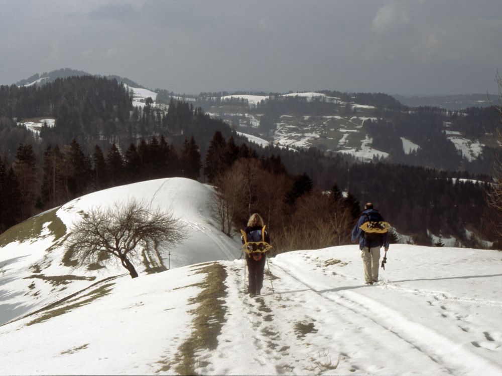In Steg folgen wir mit dem Auto dem Wegweiser "Wanderparkplatz" und landen auf einer riesigen Fläche. Es handelt sich um den Parkplatz, der zu einem Skilift gehört, welcher mangels Schnee den Betrieb eingestellt hat. Nach einigen hundert Metern der Fahrstrasse entlang zweigt der Weg ab. Ein schneebedeckter Fussweg schlängelt sich nun steil bergauf und mündet nach 200 Höhenmeter in einen Feldweg. Für die Verwendung von Schneeschuhen liegt zu wenig Schnee. Auf einem breiten Berggrat steigt der Feldweg nur leicht an und führt an einigen Höfen und einzelnen Häusern vorbei. Unser erstes Ziel, der Roten (1148m) ist auf keinem Wanderwegweiser aufgeführt. Trotzdem muss er dicht vor uns sein. Unsere Route verlässt nun den Feldweg und es wird deutlich steiler, zunächst durch freies Gelände, dann durch den Wald. An einer Stelle gabelt sich der Weg. Wir haben die Wahl zwischen einem steilen Aufstieg oder einem sehr schmalen Weg. Da der sehr schmale Weg explizit so beschildert und ebenfalls schneebedeckt ist, wählen wir den anstrengenderen aber eventuell sichereren Weg. Unterwegs sehen wir tief unter uns den "schmalen weg". Oben stehen wir an einer Kreuzung nur wenige Meter vom Roten entfernt. Den lassen wir links liegen und laufen weiter in Richtung Schnebelhorn. Ein sehr schöner Gratweg durch einen verschneiten Winterwald mit beidseitiger Aussicht auf benachbarte Hügel ist auch noch sehr gut ohne Schneeschuhe zu laufen. Doch endlich liegt genügend Schnee, um die Schneeschuhe vom Rucksack abzuschnallen und anzuziehen. Meist baumfrei bewältigen wir nun die letzten 100 Höhenmeter bis zum Gipfel des Schnebelhorns. Dort treffen wir eine andere Gruppe von Schneeschuhwanderern, die bereits zwei Tage unterwegs ist. Entsprechend gross sind ihre Rucksäcke. Eine zierliche Frau trägt einen Rucksack, beinahe in der Grösse ihres eigenen Volumens. Nach einer kurzen Pause, denn Schneefall ist in Sicht, brechen wir wieder auf. An den Bäumen beobachten wir interessante Eismuster. Es muss unlängst kalt, feucht und windig gewesen sein. Endlich der heiss ersehnte Hang, um auf unsere Kosten mit den Schneeschuhen zu kommen. Leider ist die Schneetiefe stellenweise etwas dürftig, um genüsslich den Hang hinunter zu brausen. Trotzdem haben wir schnell 150 Höhenmeter hinter uns gebracht und kehren im Berggasthaus Tierhag zu einem Kaffee ein. Nach dieser unverdienten Pause laufen wir ohne Schneeschuhe einen Fahrweg hinunter bis zur kleinen Siedlung Stralegg. Hier verlassen wir den Fahrweg wieder und queren eine Wiese. In vielen Serpentinen führt ein steiler, schneebedeckter Waldweg etwa 300 Höhenmeter hinunter bis zu einer Fahrstrasse, die jetzt direkt zu unserem Parkplatz führt. Bei Orüti verlassen wir diese Fahrstrasse nochmals und gehen den Wanderweg, der uns abseits der Fahrstrasse zum Parkplatz bringt. | ||||