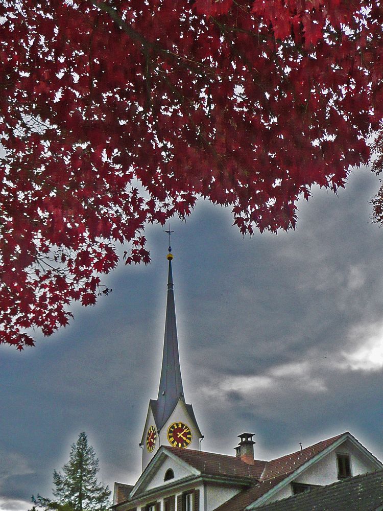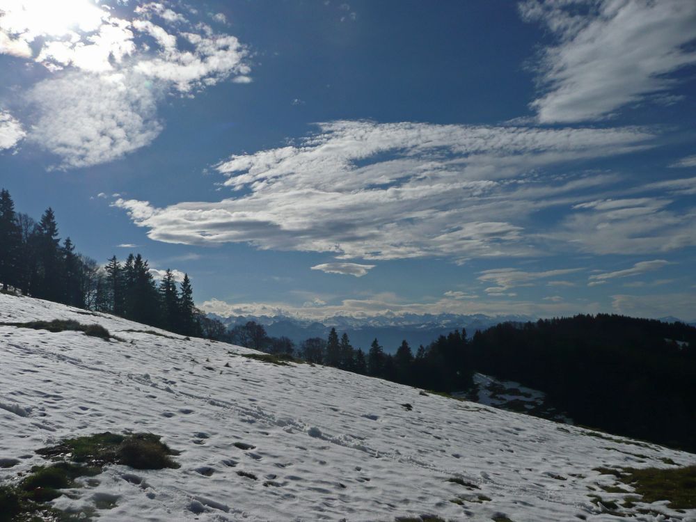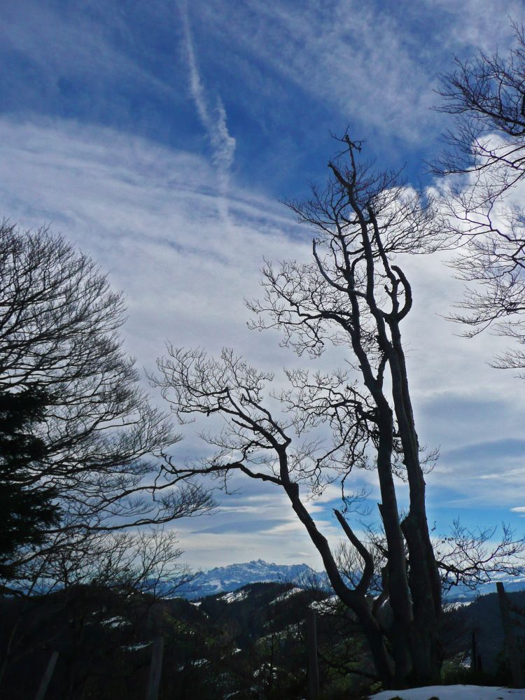 Glutrot ist der Himmel am frühen Morgen vor der Anfahrt. Eigentlich ist das ein Schlechtwetterzeichen, sieht aber trotzdem beeindruckend aus. Während der Anfahrt verschwindet dann auch die letzte blaue Ecke am Himmel.In der Ortschaft Wald parken wir auf dem Parkplatz am Bahnhof, und für 5,0 CHF Parkgebühr dürften wir das Fahrzeug bis am nächsten Tag stehen lassen. Doch wir wollen am Nachmittag wieder zurücksein. Der erste Wanderwegweiser zeigt uns nur die Richtung zum nächsten Wanderwegweiser an. Dieser jedoch, kann mit unzähligen Wanderzielen in alle Richtungen aufwarten. Unser erstes Etappenziel, die Höhenklinik, ist mit einer Stunde Gehzeit aufgeführt. Wir entfernen uns vom Bahnhofsgelände über eine Fastfussgängerzone, von der schon nach 3 Minuten rechterhand ein ansteigender Fussweg abzweigt. Den Wanderwegmarkierungen folgend, passieren wir am Ortsrand eine Wohnanlage in Terrassenanordnung, vor der offensichtlich die Wohngemeinschaft mit vereinten Kräften die Aussenanlagen winterfest macht. Wenige Minuten später verlässt der Wanderweg den Ort. Über einen Grasrücken steigt der schmale Pfad steil an. Ein Bauer hat kein Mitleid mit uns und verteilt die Gülle im hohen Bogen auf der benachbarten Wiese. Atemlos beschleunigen wir unser Tempo, um der Erstickungsgefahr zu entkommen, aber das ist eben Natur. Alle Farben bietet der bunte Mischwald über den satt grünen Wiesen. An einem Wanderwegweiser wären jetzt Würfel eine willkommene Entscheidungshilfe, denn rechts geht es zur Höhenklinik und links auch. Die Entscheidung fällt für links aus, weil dort der Weg in den bunten Laubwald eintaucht. Schon wenige Meter weiter verlässt der Weg den Wald wieder und scheint am Ende einer Wiese in einen Fahrweg zu münden. Wir wollen keinen Fahrweg gehen und wählen deshalb die weglose Variante. Über eine Wiese bis zum Waldrand und im Wald zwischen Holzstapeln hindurch, stossen wir an einen Wanderwegweiser, der auch die Richtung zur Höhenklinik anzeigt. Etwa 10 Minuten lang folgen wir einem schönen Waldweg, mit herrlicher Aussicht auf die Glarner Alpen. Dann stoppt uns ein Weidezaun, nicht wirklich. Wir übersteigen den Zaun, lenken junge paar Kälber vom Futtern ab und landen schliesslich auf der asphaltierten Zufahrtsstrasse zur Höhenklinik. Dieser folgen wir ein paar Hundert Meter bergwärts bis zum Parkplatz der Höhenklinik. Dort gibt es einen echten Oldtimer zu bewundern, einen alten Ford. In der Nähe der Höhenklinik wird offensichtlich bereits das Mittagessen zubereitet, ein etwas angenehmerer Geruch kriecht in die Nasenlöcher als vor einer dreiviertel Stunde. An mehreren grossen Wohnhäusern vorbei, passieren wir nach 10 Minuten Chrinnen, wo Ferien auf dem Bauernhof angeboten werden. Während des weiteren Aufstiegs über ein Betonsträsschen weitet sich der Blick und ein Teil des Zürchersee kommt zum Vorschein. Im leichten Dunst ist der Damm bei Rapperswil zu sehen. Bei der Cholihütte lesen wir, dass man sie mieten kann. Sie bietet 30 Schlafplätze und soll 140 CHF pro Nacht kosten. Allerdings muss man auf Strom und Dusche verzichten. An steilen Wänden aus Nagelfluhgestein vorbei, laufen wir in gut 10 Minuten bis zur Farner Alp hinauf. In der Nähe der Bergstation eines Skiliftes gibt es ein Selbstbedienungsrestaurant, das aber im Moment geschlossen ist. Wir bewundern den garagengrossen Brennholzstapel, der vortrefflich als Holzhäuschen verkleidet ist. In der nächsten halben Stunde steigen wir etwa 150 Höhenmeter zum Gipfel des Schwarzenberg hinauf. Unterwegs streifen wir riesige Felsblöcke aus Nagelfluhgestein, sehen ins grüne Goldinger Tal hinunter und staunen über die Wolkenbildung über den Gipfeln der Glarner Alpen. Die blauen Wolkenlöcher über dem Horizont scheinen sich zu vergrössern. Am steilsten wird es kurz vor dem Gipfel, wo Laubbäume schon sämtliche Blätter haben fallen lassen, so dass es herbstlich raschelt, wie wir durch den dichten Laubteppich stapfen. Die beiden Sitzbänke am Gipfel werden schnell frei gemacht, denn nun ist es vorbei mit der Gipfelruhe, da wir als Gruppe daher gepoltert kommen. Jetzt werden Kuchen und ein, zwei, drei Gipfelschnäpschen verteilt. Richtung Norden machen wir uns an den Abstieg, mit dem Etappenziel Obere Boalp. An einem Wegkreuz, nur 5 Gehminuten von der Oberen Boalp entfernt, beschliessen wir einstimmig, also mit einer Stimme, die Tour um den Besuch des Höchhand zu erweitern. Inzwischen treffen uns auch erste Sonnenstrahlen, so dass uns die Schneereste auf den Wiesen nicht sonderlich stören. Die erwachsenen Mädels können es sich nicht verkneifen, eine Schneeballschlacht anzuzetteln. Da wir vom Schwarzenberg schon einige Meter abgestiegen sind, dürfen wir auf den Gipfel des Höchhand noch einmal fast 100 Höhenmeter aufsteigen. Am Anfang stapfen wir noch über teilweise schneebedeckte Wiesen, dann verläuft der schmale Pfad über einen Grat. Schliesslich stossen wir auf einen Wanderwegweiser mit einer ungewöhnlich kurzen Zeitangabe, 2 Minuten bis Höchhand. Wenn es steil aufwärts geht, können auch 2 Minuten ziemlich anstrengend sein. Am Gipfel erreichen wir den höchsten Punkt unserer Wanderung. Über eine sehr steile, mit Drahtseil gesicherte Passage, könnte man den Gratweg weiter verfolgen. Wir müssen aber langsam an den Rückzug denken. Zu dieser Jahreszeit ist es nicht mehr so lange hell. Wir steigen den breiten Grat in Richtung Nordwesten ab, schmeissen noch den einen oder anderen Schneeball und erreichen nach 30 Minuten die mehr als 250 Höhenmeter tiefer liegende Alp Schwämi. Der Himmel ist inzwischen richtig blau und Schnee gibt es auf dieser Höhe keinen mehr. Also gönnen wir uns noch einmal eine kleine Rast. Weiter geht es unwesentlich abwärts, auf dem Schotterweg, in Richtung Wolfsgrueb. Der Wanderwegweiser prophezeit eine Gehzeit von 35 Minuten. Dass wir 5 Minuten länger brauchen liegt wohl daran, dass wir immer wieder stehen bleiben, und einen der vielen kleineren Wasserfälle