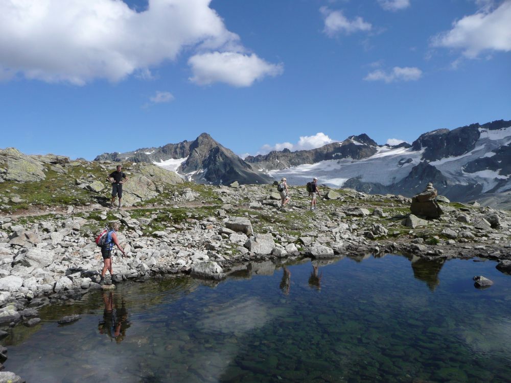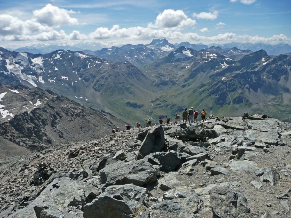 Mit dem Timing der Anfahrt klappt es dieses mal nicht so richtig. Die Erstankömmlinge warten ziemlich lange auf die Nachzügler. In schnellem Schritt geht es los, als wolle man die versäumte Zeit aufholen.Unser Parkplatz liegt ca. 1 km unterhalb von Ospiz am Flüelapass in Richtung Osten. Wir laufen noch etwa 300m die Flüelastrasse hinunter, bis rechterhand ein Wanderwegweiser die Richtung zum Schwarzhorn anzeigt, leider ohne Zeitangaben. Wir folgen dem steilen Wiesenpfad, mal im Zickzack, mal übers Geröll und mal an einer Felswand entlang. In Richtung Radönt taucht ein türkisfarbenes Seelein auf. Langsam verstummt der lästige Verkehrslärm von der Flüelastrasse. Die Vegetation wird immer spärlicher und wie wir nach anderthalb Stunden die Schwarzhornfurgga erreichen ist es damit so gut wie ganz aus. Nur noch einzelne Blumenbüschel schauen hie und da zwischen den Steinen heraus. Die kommen aber so voll zur Geltung. Die rotweissen Wanderwegmarkierungen sind ganz frisch, so dass der Eindruck entsteht, die Farbe wäre noch nass. Der Streckenabschnitt von der Schwarzhornfurgga zum Gipfel des Schwarzhorn ähnelt einer Mondlandschaft. In einer guten halben Stunde schaffen wir den Aufstieg, der anfangs etwas steiler, zum Schluss flacher wird. Wir freuen uns über jeden Wanderer, der uns entgegen kommt. Von Weitem war schon zu sehen, dass am Gipfel keine Einsamkeit herrscht. Eine Gruppe trällert noch ein Liedchen und tritt dann im Gänsemarsch den Abstieg an. So haben wir den Gipfel fast für uns. Rundherum verdeckt kein einziger Berg die Sicht. Wir erkennen den nahen Piz Kesch, die weiter entfernten Churfirsten, die Schesaplana und andere Gipfel des Rätikon. Aber die Namen der meisten anderen Gipfel sind uns unbekannt. Im Nordwesten sehen wir durch das Dischmatal bis Davos und im Norden die beiden Seen am Flüelapass, den Schottensee und den kleineren Schwarzsee. Am zerstörten Gipfelkreuz stellen wir uns in Position für ein Gruppenfoto. Ein fremder Wanderer bietet seine Knipsdienste an. Damit handelt er sich etwas Stress ein, denn wir sind 12 Personen und fast jeder hat seine Kamera dabei. Eine knappe Stunde rasten wir und brechen dann zum Abstieg auf. Nur unwesentlich weniger Zeit als für den Aufstieg benötigen wir für den Rückweg zur Schwarzhornfurgga, denn im steilen, sandigen Hang kommt man leicht ins Rutschen. Von der Schwarzhornfurgga folgen wir ca. 300m dem Pfad, den wir gekommen waren. Dann zeigt ein Wanderwegweiser die Richtung zur Grialetschhütte an. Auf der digitalen Karte von SwissMap ist dieser Weg nicht eingetragen, wohl aber auf der Wanderkarte von Kümmerly+Frey. Weg wäre auch die falsche Bezeichnung. In ausreichendem Abstand sind Felsbrocken und Steine mit rotweissen Markierungen versehen. Gelegentlich ist eine Trittspur zu erahnen. Ansonsten ist in der Mondlandschaft Trittsicherheit von Vorteil. Wir passieren zwei kleine Seen, die wir bereits während des Aufstieges die längste Zeit von oben bewundern konnten. Etwa eine Stunde laufen wir fast auf einer Höhenlinie in Richtung Osten. Dann lenkt ein Wanderwegweiser in Richtung Südosten, den Berg hinauf, zum Pass Fuorcla Radönt. Das Schwarzhorn wird auf dem Wegweiser Schwazhorn genannt. Wir erreichen Fuorcla Radönt in ca. 15 Minuten. Ein herrlicher Blick öffnet sich auf eine Bergwelt mit Gletschern und Seen. Den Schnelleren ist eine Rast gegönnt, bis die Nachzügler eintreffen. Deren Rast fällt etwas kürzer aus. Auf der folgenden Strecke wird nun Trittsicherheit aufs härteste geprüft. Während die Einen von Block zu Block hüpfend über die Geröllfelder balancieren, krabbeln die Anderen auf allen Vieren im Felslabyrinth auf und ab. Eine Stunde lang dauert die Turnerei durch das abwechslungsreiche Felslabyrinth, unterbrochen durch kleine Seen, Schneefelder und kurze Pausen. Wegmarkierungen sind an meterhohen Stangen befestigt, damit sie auch im Winter zu sehen sind. Endlich tauch sie auf, weit unten, die Grialetschhütte. Für den Abstieg benötigen wir eine viertel Stunde. Die Grialetschhütte liegt in unmittelbarer Nähe eines kleinen Sees. Den grösseren Furggasee bekommen wir nicht zu Gesicht. Wir interessieren uns erst mal nur für die Terrasse und die Getränkekarte. Obwohl unsere letzte Etappe laut Wanderwegweiser noch zweidreiviertel Stunden dauern wird, gönnen wir uns eine Stunde Pause. Etwas ratlos stehen wir nach der Pause an einem handbeschriebenen Wegweiser, der zwei Richtungen anzeigt, Val Grialetsch und Flüelastrasse. Laut Wanderkarte wäre Val Grialetsch unser Weg. Nach Rückfrage beim Personal der Grialetschhütte entscheiden wir uns für Flüelastrasse. Die Beschreibung auf der Karte ist an diese Stelle etwas irreführend. In der Abendsonne laufen wir den schmalen Bergpfad mit einigen kleineren Gegenanstiegen in Richtung Norden, bis er nach ca. 4km einen Bogen in Richtung Westen macht. Die Flüelastrasse ist jetzt weit unten zu sehen und der Pfad geht endlich steil abwärts. Wir müssen noch etwa 150 Höhenmeter absteigen. An der Flüelastrasse angekommen, fehlt noch etwa ein Kilometer bis zum Parkplatz. Die Motivation, an der Strasse leicht ansteigend dort hin zu laufen, ist bei manchen auf dem Nullpunkt. Aber über den Pfad abseits der Strasse sind wir doch schnell am Ziel. Die auf dem Wanderwegweiser angegebene Gehzeit haben wir um eine Stunde, mehr als ein Drittel, unterschritten. Allerdings sind wir nicht bis Ospiz am Flüelapass gelaufen, sondern einen Kilometer weniger. | ||||||||||||||||
