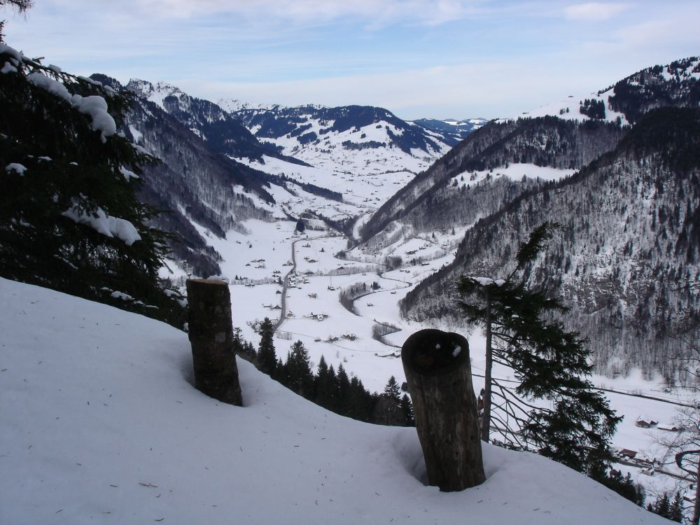 Aus Rücksicht auf die beiden Hunde, die uns begleiten, verzichten wir auf die Benutzung des Sesselliftes, der uns schnell auf die Alp Sellamatt gebracht hätte. Statt dessen stapfen wir die 400 Höhenmeter am Rande der Skipiste hinauf und machen erst bei einer eingeschneiten Hütte kurz vor der Bergstation eine kurze Trinkpause. Bei der Bergstation verlassen wir die bevölkerten Hänge und verfolgen Schneeschuhspuren in Richtung Westen. Schon nach wenigen hundert Metern glauben wir nicht mehr, auf dem richtigen Weg zu sein. Querfeldein ziehen wir in Richtung Süden eine neue Spur den Hang hinauf. Aber schon bald sind wieder mehrfach begangene Spuren in Sicht, die eher unserer gewünschten Richtung entsprechen. Auf einer Anhöhe steht eine Wanderin ohne Schneeschuhe und kommt nicht so recht weiter, denn der Fönsturm hat hier oben alle Spuren verwischt. So tappen auch wir jetzt wieder im Dunkeln. Auf der zunächst baumlosen Ebene laufen wir weiter in Richtung Westen, in der Hoffnung, irgendwann wieder auf eine Markierung oder eine Spur zu treffen. Wenn uns der Fönsturm nicht gerade Schnee ins Gesicht treibt, sehen wir auch in der Ferne wieder Anzeichen von Spuren. Sobald wir aber wieder ins freie Gelände kommen, sind die Spuren vom Winde verweht. Das Spiel wiederholt sich bis wir in dichter bewaldetes Gebiet kommen. Am windgeschützten Nordhang der Vorder- und später Hinteren Rossweid laufen wir auf meist gut gespurten Pfaden stetig bergab, immer wieder das gegenüberliegende Säntismassiv im Blickfeld. Die letzten 150 Höhenmeter kämpfen wir uns durch schweren und pappigen Schnee über baumfreie Hänge hinunter nach Eschen, einer kleinen Siedlung. Hier haben unsere Schneeschuhe ausgedient. Die restlichen 2,5 km bis zu unserem Ausgangsort Alt St.Johann laufen wir gemütlich auf einem Fahrweg an der Thur entlang.