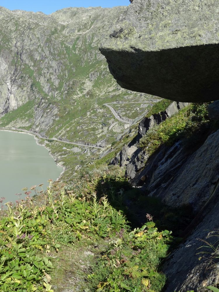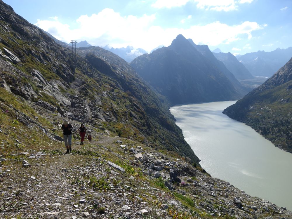 Von See zu See hangeln wir uns über unzählige Serpentinen zum Grimselpass hinauf. Schon am Räterichsbodensee sind kaum mehr Bäume zu sehen. Nach einigen Kurven sind wir am Grimselsee noch immer nicht am Ziel. Erst auf 2165m Meereshöhe parken wir am Grimselpass auf einem der Parkplätze des alten Hotels Alpenrösli. Dank der gehobenen Meereshöhe haben wir mit den angekündigten Tagestemperaturen von 35 Grad nichts zu tun. Im Gegenteil, ein frisches Windchen pfeift uns um die Ohren.Am Wanderwegweiser ist das Sidelhorn mit einer Gehzeit von 1 h 40 min angeschrieben. Wir wollen aber einen kleinen Umweg über den Jostsee im Süden des Sidelhorns machen. Deshalb laufen wir den nicht markierten Pfad zwischen Murmeltierpark und Toteseeufer zu dessen am Westufer und folgen diesem in Richtung Süden. Nach zweihundertfünfzig Metern gabelt sich der Pfad und ein Wanderwegweiser zeigt geradeaus das Siedelhorn an. Wir aber zweigen nach links, in Richtung Oberwald ab. Beim Zurückschauen sehen wir über den Totesee hinweg zum Hotel Alpenrösli, das von den markanten Spitzen der Gärstenhörner überragt wird. Ein kurzes Stück des Weges ist wie ein alter Römerweg mit Natursteinen gepflastert. Nach weiteren vierhundert Metern gabelt sich der Wanderweg erneut. Diesmal entscheiden wir uns für die rechte Variante, wo jetzt am Wanderwegweiser Sidelhorn angeschrieben ist. Wir befinden uns auf dem Regionalen Fernwanderweg Via Sbrinz (40). Während wir uns langsam vom Totesee entfernen, taucht rechts von den Gärstenhörnern ein mächtiger Schneegipfel auf. Es handelt sich um den Galenstock, unter dem der Rhonegletscher viel Wasser in Form von Eis speichert. Fast auf einer Höhenlinie, mit nur wenig auf und ab, macht der Pfad in den nächsten anderthalb Kilometern einen leichten Rechtsbogen und stösst am Nassbode auf ein kleines Holzhäuschen. Den Totesee verlieren wir aus den Augen, doch passieren wir dafür ein paar kleine und ganz kleine Tümpel, in denen sich die Berge des Wallis spiegeln. Die felsige Oberfläche, über die auch teilweise der Pfad führt, ist von der Witterung glatt geschliffen, fast wie ein Kinderpopo. Beim Holzhäuschen am Nassbode zweigt der Wanderweg zum Sidelhorn nach rechts ab. Der Jostsee ist am Wanderwegweiser mit 45 min Gehzeit angeschrieben, in gleicher Richtung wie das Sidelhorn, das jetzt mit 1 h 50 min angegeben ist. Steil steigen wir nun einhundertfünfzig Höhenmeter an, auf einer Distanz von knapp siebenhundert Metern erst nordwärts dann westwärts, bis der Pfad in den Wanderweg mündet, der auf kürzestem Weg vom Grimselpass her führt. Waren wir auf dem Umweg über Nassbode noch einsam unterwegs, gesellen sich jetzt mehrere Gruppen von Wanderern hinzu. Im weiteren Anstieg begleiten uns die Wandersleut' als bunte Punkte in der Berglandschaft und immer mehr Gleitschirmflieger als bunte Punkte im stahlblauen Himmel über den Gipfeln der Umgebung. Auf dem ausgetretenen Pfad, und immer andere Wanderer vor Augen, verpassen wir beinahe die Abzweigung zum Jostsee. Auf der Wanderkarte ist wohl ein direkter Pfad zur Triebtenseelicke eingezeichnet, doch der offizielle Wanderweg macht einen Abstecher Richtung Süden, zum Jostsee. Das Gefühl, auf dem falschen Weg zu sein, wird bestätigt, wie wir gerade noch rechtzeitig auf das Display des Tablet-PC mit Navi-App schauen. Mit offenen Augen hätten wir vielleicht den Hinweis auf einem Fels gesehen, der die Richtung zum Jostsee andeutet. Wenige Meter kreuzen wir den Hang südwärts und folgen dann dem anfangs sehr feuchten, etwas weniger ausgetretenen Pfad. Etwa sechzig Höhenmeter steigt der Pfad die ersten dreihundert Meter bis auf eine Hochebene an. In einem Teich fotografieren wir die Spiegelungen zweier Berggipfel, ohne zu ahnen, dass wir in absehbarer Zeit auf beiden Gipfeln stehen werden. Die nächsten zweihundert Meter spazieren wir gemütlich auf einer Höhenlinie, bis endlich der Jostsee zum Vorschein kommt. Schon von weitem fällt am Ufer ein weisses Band auf, das sich beim Nähern als ein Blütenmeer von Wollgras entpuppt. Noch vor dem Jostsee zweigt der Wanderweg scharf rechts ab, direkt in Richtung Norden. Der Wanderwegweiser gibt für die Triebtenseelicke eine Gehzeit von 35 min an. Wir sind aber vom Wollgrass im Uferbereich so begeistert, dass wir weglos im Uhrzeigersinn den Jostsee umrunden. Nur schwer können wir den Jostsee loslassen und steigen, nachdem wir oberhalb eine rotweisse Wanderwegmarkierung entdeckt haben, nordwärts den Hang hinauf. Nach knapp vierhundert Metern und fünfzig Höhenmetern wendet sich der Pfad nach Westen. Von der rechten Seite mündet die Abkürzung in den offiziellen Wanderweg, die die meisten Wanderer genommen hatten. Beim Abstecher auf dem offiziellen Wanderweg zum Jostsee hatten wir keine fremden Wanderer getroffen und gesehen. Eine karge Berglandschaft liegt vor uns. Nur noch wenige grünbraune Grasflecken können zwischen den Felsen existieren. Nach einem mässigen Anstieg von einhundert Höhenmetern und einer Strecke von einem halben Kilometer stossen wir an ein unüberwindlich erscheinendes, steiles Geröllfeld, mit einzelnen Felsbrocken, so gross wie mehrstöckige Häuser. Eine ganze Wandergruppe sonnt sich auf einem einzigen Felsblock. Um die Felsmonster herum und über grobes Gestein hinweg schlängelt sich der angedeutete Pfad noch etwa fünfzig Höhenmeter bis zu einem Schneefeld hinauf. Hoch über dem Schneefeld sehen wir auf dem Gipfel eines überdimensionalen Steinhaufens einen Antennenmast. Einzelne Kraxler turnen in den Steinen unterhalb des Gipfels herum. Wir umgehen das breite und steilen Schneefeld weglos im Uhrzeigersinn und erreichen so den Sattel mit dem Namen Trübtenseelücke, in den meisten Karten und auf Wanderwegweisern als Triebtenseelicke bezeichnet. Ein neuer Blickwinkel Richtung Nordwesten eröffnet sich. Die Gipfel von sehr markanten Bergen, wie Finsteraarhorn, Lauteraarhorn und Schreckhorn kommen zum Vorschein. Darunter fliesst ganz langsam der U