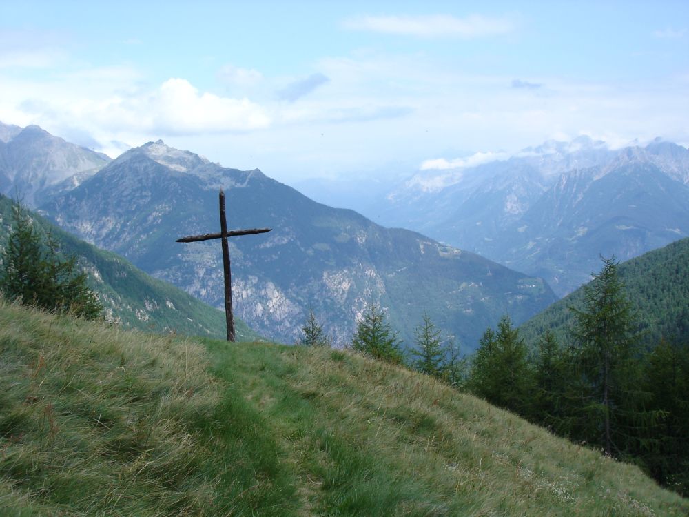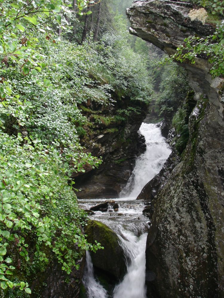 Nach dem Bergfrühstück verlassen wir unsere Unterkunft Rif. Gusone und wandern bei leichtem Nieselregen in Richtung Osten, bergab durch das Valle di Starleggia. Vor uns liegen mehr als 1300 Höhenmeter Abstieg. Bis zum kleinen Bergdorf Starleggia führt der Weg, ein weiterer Abschnitt des T.V.S., über feuchte Wiesen. Starleggia ist mit dem PKW erreichbar, eine Asphaltstrasse führt in unzähligen Kehren hinauf. Diese Asphaltstrasse benutzen auch wir. So müssen wir öfters unseren Schritt anhalten, um Autos passieren zu lassen. Am sehr steilen Hang lassen sich die Serpentinen nicht abkürzen und auf der Wanderkarte sind auch keine Alternativen eingezeichnet. Über Splughetta, einem weiteren Bergdorf, erreichen wir schliesslich die Autostrasse 36, die den Splügenpass mit Chiavenna verbindet. Am Campingplatz von Campodolcino retten wir uns vor dem Regen in eine überdachte Terrasse eines Kiosks. Eigentlich wollen wir das Ende des Regens abwarten und trinken ein paar Tassen Kaffee. Da aber keine Besserung in Sicht ist, ziehen wir doch unsere Regenjacken an und machen uns wieder auf den Weg. Unser Fahrzeug steht etwa 10 Kilometer südlich, im 500 Meter tieferen S. Giacomo-Filippo. Der Weg dort hin wird als "Via Spluga" oder auch "Sentiero del Giubileo" bezeichnet. Er führt am Wasserlauf Liro, unweit der Autostrasse 36 entlang, welche aber so gut wie nie zu sehen ist. Sowohl bewohnte Siedlungen, als auch längst verlassene und verfallene Siedlungen liegen auf der Strecke. Die ersten Kilometer ist der Weg sehr breit, teilweise auch asphaltiert. Gelegentlich ist über eine Hängebrücke der Fluss zu überqueren. Später wird mehr Trittsicherheit verlangt. Der Weg wird schmaler und führt kilometerweit durch ein Labyrinth von Felsen. Ein Wasserfall erinnert an den Beginn der mehrtägigen Tour, wir sind kurz vor S. Giacomo-Filippo. Dessen Kirchturm taucht schon zwischen den Bäumen auf. Auf bekanntem Weg gehen wir nun die letzten Schritte, bis zum Parkplatz, wo das Auto geduldig auf unsere Rückkehr wartet. Die Rückfahrt zwingt uns, wie bei der Anreise, auf den Splügenpass. Unterwegs laden wir unweit von Isola zwei unserer Wanderkameraden auf, die eine andere Weg-Variante gewählt haben.