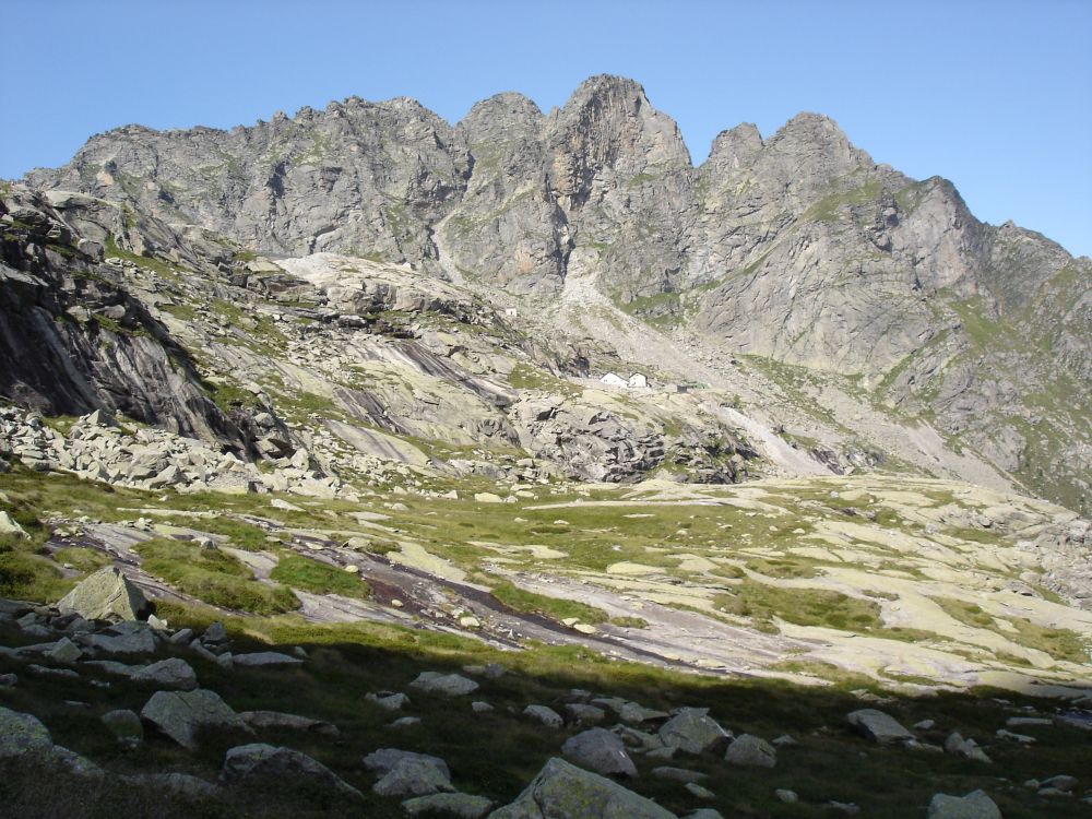 Wenige Parkplätze gibt es in S. Giacomo Filippo, denn das alte Dörfchen liegt am steilen Hang im Valle San Giacomo. Wir stellen das Auto ab und packen unsere schweren Rucksäcke. Auf einem Asphaltsträsschen, das nach S. Bernardo hinauf führt, laufen wir durch das Dörfchen. Schon nach wenigen hundert Metern öffnet der Himmel seine Pforten. Wir finden unter einem Dach Unterschlupf. Nach einer halben Stunde setzen wir den Marsch fort. Nur mit wachsamen Augen ist die Wegmarkierung zu erkennen, die uns von der Strasse weg lockt. Wären da nicht die Wegmarkierungen, hätten wir Skrupel, über die privat anmutenden Grundstücke zu laufen. Im dichten Kastanienwald verläuft der Weg in gebührendem Abstand zur Landstrasse 36, die den Splügenpass mit Chiavenna verbindet. Nach einem kleinen Wasserfall zweigt unser Weg nach Osten ab. Er trägt die Bezeichnung C25 und ist ein Teilstück des T.V.S. (Trekking Valle Spluga). In Serpentinen schlängelt sich der breite, aus massiven Natursteinblöcken erbaute Wanderweg den steilen Berg hinauf. Stellenweise verdeckt trockenes Laub den Weg, so dass wir einmal im weglosen Gelände stehen. Nach mehr als 500 Höhenmetern erreichen wir das Bergdorf S. Bernardo. Hier gönnen wir uns eine kleine Trinkpause, denn es geht noch mal 150 Höhenmeter hinauf, bis San Rocco. Die Wegweiser führen uns durch die schmalen Gassen zwischen den Häusern hindurch. Die folgenden 2 Kilometer, durch das Tal Valle del Drogo, sind etwas unbeschwerlicher, da bis zu der Siedlung Caurga kaum Höhenmeter zu überwinden sind. Die Siedlung macht einen aussergewöhnlich gepflegten Eindruck. Vermutlich werden die meisten renovierten Häuser als Ferienhäuser genutzt. Im letzten Haus der Siedlung sollen wir den Schlüssel für die Biwak-Hütte, unserem Tagesziel, erhalten. Nur dem Umstand, dass wir einem Schild folgen, das kalte Getränke verspricht, verdanken wir es, dass wir zum Hüttenschlüssel kommen. Die kalten Getränke gibt's obendrein. Die Wegbeschreibung der Einheimischen ist wohl eher was für desgleichen. Die versprochene Abzweigung verpassen wir. So wechseln wir ungewollt auf den Weg mit der Bezeichnung C28, der aber auch zu unserem Ziel führt. Sehr steil führt jetzt der Pfad in kurzen Serpentinen durch einen lichten Wald den Berg hinauf und will nicht mehr enden. Erst nach einigen Hundert Höhenmetern verlässt der Pfad den Wald und mündet in eine Hochebene. Dort stehen einige alte Natursteinhäuser inmitten von hohem Gras, scheinbar unbewohnt, aber ein Mann im Millitärlook verrichtet irgend eine Arbeit. Die Wegmarkierungen haben sich wieder einmal unsichtbar gemacht. In der Richtung, die uns der Mann anzeigt, finden wir wieder leichte Anzeichen eines Pfades. Erst nach einer Pause verfolgen wir den Pfad, der uns zunächst durch dichtes Gestrüpp am Hang entlang führt und dann in einem steinernen Meer mündet. Durch ein Labyrinth von Felsbrocken hindurch geht es weiter aufwärts, bis endlich auf über 2000m der Stausee Bacino del Truzzo vor uns auftaucht. In dieser Höhe pfeift ein kalter Wind, so dass wir keine längere Pause mehr einlegen wollen. Zwischen den Felsen hindurch sind noch kleinere Steigungen zu überwinden, bis schliesslich unser Tagesziel, die Biwak-Hütte Rif. Carlo Emilio vor uns liegt. Zwei Schafe begrüssen uns vor der Hütte. Ab jetzt ist Hausarbeit angesagt. Holzofen anheizen, Gas einschalten, Solaranlage in Betrieb nehmen und Wasser holen. Die Hütte liegt direkt am kleinen See L. Nero. In der Nacht sehen wir die Lichter der Alpe Truzzo, die wir bei Tageslicht nicht gesehen haben, da sie sich so gut in die Landschaft einfügt.
