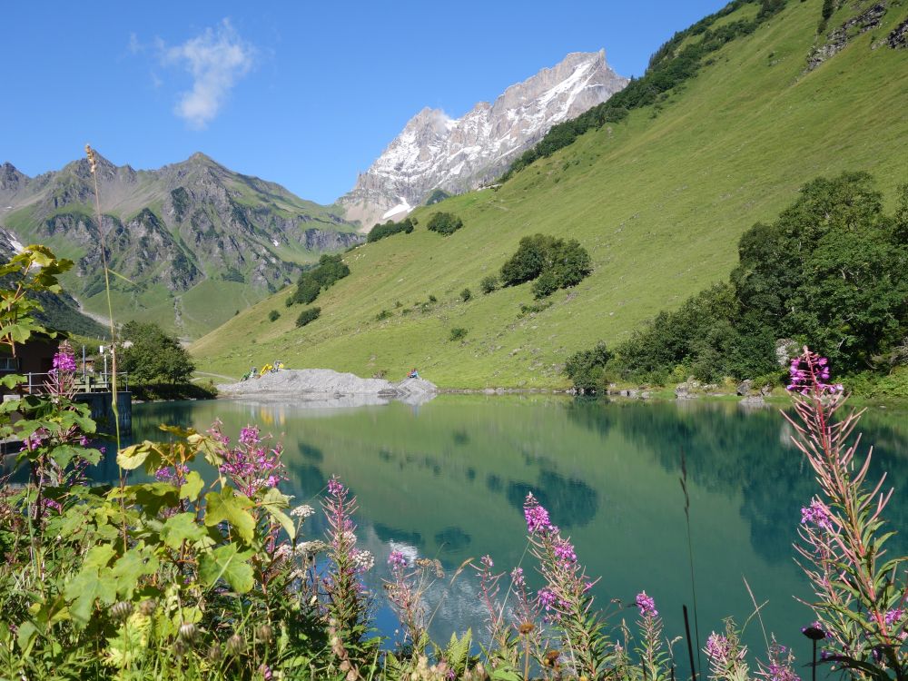 Wir kaufen uns ein Retour-Ticket für 15,00 Schweizerfranken und warten auf die nächste Gondel der Luftseilbahn. Mit uns warten auch ein paar Biker, die von Brüsti aus über den Surenenpass radeln wollen. Sie wählen dafür aber eine Strecke, die wir auf dem Rückweg laufen wollen, sodass wir uns nicht in die Quere kommen werden. Auf zwei Gondeln verteilt, warten wir an der Bergstation gerade mal zehn Minuten, bis der Rest der Gruppe mit der nächsten Gondel ankommt. In der Zeit können wir die vielen Ziele auf den Wanderwegweisern studieren. Über Alp Waldnacht ist der Surenenpass mit einer Gehzeit von 3h 10min angeschrieben. Der Surenenpass ist unser Ziel und zugleich der Wendepunkt der Wanderung. Da wir über Alpnacht zum Surenenpass laufen wollen, steht uns zunächst ein kleiner Abstieg bevor. Wir passieren die Bergstation der altertümlichen Luftseilbahn Waldnacht - Brüsti, die zwar 3 Personen oder 250 kg Material transportieren darf, aber im Moment still steht, und folgen dem breiten Pfad den Wiesenhang hinab. Vor dem Wald wendet sich der Pfad in Richtung Westen, macht dann aber im Wald einen scharfen Bogen nach Osten. Nachdem wir unter dem Seil der Luftseilbahn durch sind, fällt einem Mitwanderer ein schmaler Abzweig nach rechts auf, den steilen Waldhang hinab. Da der Abzweig eher einem ausgetrockneten Bachbett ähnelt, zögern wir noch, entscheiden uns schliesslich doch für die Abkürzung. Der Normalweg würde weiter nach Osten, über Höchiberg führen, und erst nach zweihundertfünfzig Metern eine Kehre nach Waldnachter Bergen machen. Wir steigen also nach Süden den steilen Pfad hinab und erblicken bald vom Waldrand aus die Häuser von Waldnachter Bergen mit dem Waldnachtersee inmitten von grünen Wiesen. Auf einem Wiesenpfad laufen wir zu den Gebäuden hin und passieren dabei die Talstation der Luftseilbahn, wo die zweite offene, aber überdachte Gondel der Seilbahn geparkt ist. An einer kleinen Kapelle vorbei, laufen wir ein, in Natursteinmauern eingefasstes Weglein, auf den Waldnachtersee zu. Die hüfthohen Mauern erlauben und Makrofotos von blühenden Alpenblumen zu knipsen, ohne in die Knie gehen zu müssen. Am Seeufer bewundern wir das bunte Farbenspiel der Natur. Über den lila blühenden Weidenrösschen im Vordergrund spiegeln sich in der türkisfarbenen, spiegelglatten Oberfläche des Sees die leuchtend, hellgrünen Wiesen und die mit weissen Schneeflecken übersäten Felstürme des Hintergrunds. Nur drei Bagger auf den Kieshaufen am anderen Seeufer stört ein wenig das Idyll. Fast ohne Anstieg laufen wir genüsslich durch das lange, grüne Tal der Waldnacht in Richtung Westen auf das Talende zu, passieren dabei die einsamen Almen Gross Hütte und Lang Hütte und überqueren nach mehr als anderthalb Kilometern nahe der Alm Sennenstein den Angibach. Der Angibach vereint sich unweit von hier mit dem vom Südwesten herab fliessenden Guggitalerbach zum Bockibach und fliesst durch das Tal weiter bis in den Waldnachtersee, den er langsam mit Kies auffüllt, wären da nicht die Bagger. Am Steg über den Angibach endet der breite Wirtschaftsweg und es geht auf einem Wiesenpfad weiter, den ausser den Wanderern höchstens noch die Kühe nutzen. Ein blau markierter Alpinwanderweg über Älpligriess zur Kröntenhütte SAC zweigt nach links ab. Wir geniessen den nur sanft ansteigenden Wiesenpfad und freuen uns über die bezaubernde Flora, umgeben von atemberaubenden Felsspitzen unter stahlblauem Himmel. Nach dem Durchgang durch eine Öffnung des Weidezaunes wird der Pfad zunehmend schlammig und die Steigung nimmt zu. Vom herumstehenden Rindvieh werden wir misstrauisch beäugt. In der Spur versinken wir bis zum Knöchel im Morast, weshalb wir mit mehr oder weniger Erfolg versuchen, rechts und links vom Pfad auf festen Untergrund auszuweichen. So erweitern wir die Länge des Zickzack-Weges noch im den Zickzack innerhalb jeder einzelnen Serpentinenschleife. Erst nach vielen Höhenmetern wird der Untergrund trockener, teilweise sogar felsig und auf der Talseite ist der Pfad durch einen Weidezaun gesichert. Nach etwa zweihundertfünfzig Höhenmetern erreichen wir eine Hochebene, wo wir unweit der Alm Eifrutt den Angibach auf einem schmalen Eisensteg überqueren und uns erst mal ein wenig ausruhen. Während einer kurzen Rast schöpfen wir neue Kraft, um die noch anstehenden fünfhundert Höhenmeter bewältigen zu können. Den Felswänden mit vielen Wasserfällen sind wir nun erheblich näher. Durch eine bunte Alpenflora steigt jetzt der steinige Pfad im Zickzack und in der Nähe des Angibaches den steilen Wiesenhang hinauf. Das helle Grün der Wiesen weicht ganz langsam dem Grau der Felsen. Wir passieren einen garagengrossen Felsblock und stossen bei einer Weggabelung auf einen Wanderwegweiser. Der Standort ist am Wanderwegweiser mit Langschnee bezeichnet. Der Name wird wohl daher kommen, dass hier lange der Schnee liegen bleiben wird. Trotz Sommermonat August sehen wir über den angrenzenden Schotterfeldern Schneereste liegen. Auf dem Wanderwegweiser ist nach rechts die Bergstation Brüsti mit einer Gehzeit von 1 h 30 min angeschrieben. Das wird nach einem Abstecher zum Surenenpass, der nach links mit einer Gehzeit von 45 min angeschrieben ist, unser Rückweg sein. Nur als kleine Punkte sind die Wanderer auf dem Surenenpass von hier aus zu erkennen. Immerhin liegt er noch fast dreihundert Höhenmeter über uns. Am Rande des sprudelnden Bächleins machen wir erst mal wieder eine Rast, bevor wir weiter den steinigen Felspfad die nur noch mit spärlichem Grün bedeckten, aber trotzdem blumenreichen Schotterhänge hinauf steigen. Nach einer knappen Stunde Aufstieg gesellen wir uns unter die anderen Wanderer, die bereits am Surenenpass sitzen. Vom Pass aus sehen wir weit in das Tal Surenen hinein, das erst nach einem Rechtsbogen bei Engelberg endet. Überragt wird das Tal von den steilen, schneebedeckten Felsgipfeln des Titlis. Auf der anderen Seite des Passes, wo wir aufgestiegen ware