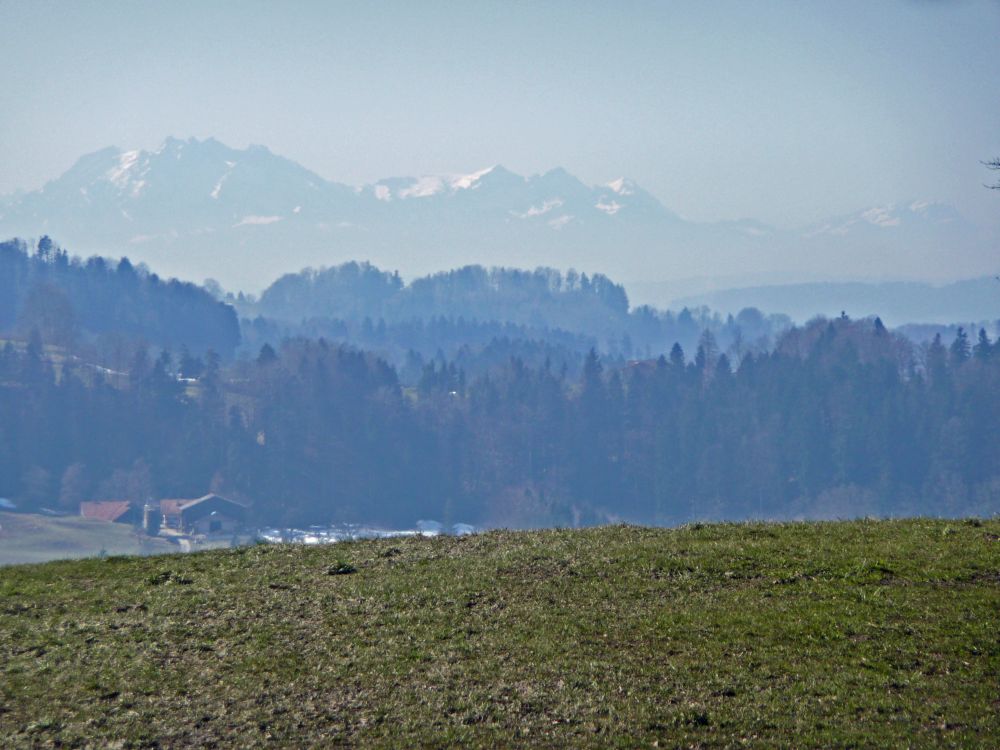 Südlich des Klosters Fischingen, an der Abzweigung nach Kirchberg, finden wir am Strassenrand kostenlose Gelegenheit zu parken. Ein paar Meter laufen wir nordwärts am Kloster vorbei und die Strasse hinunter. Dann zweigt nach links ein Wanderweg ab. Der Wanderweg zeigt das Ziel Rotbüel an, auf einigen Wanderkarten unter dem Namen Roopel aufgeführt.Nach den letzten Häusern steigt der Weg sofort steil an und wendet sich nach links in Richtung Südwesten. In der ersten halben Stunde gewinnen wir über 200 Höhenmeter. Eine Tafel verspricht in einer Minute Gehzeit einen Aussichtspunkt. Er liegt abseits unserer geplanten Route, aber diese eine Minute wollen wir investieren. Vermutlich hat die Tafel durch den Wachstum der Bäume ihre Aktualität eingebüsst, denn auch nach mehreren Minuten Gehzeit können wir den angekündigten Aussichtspunkt noch nicht erkennen. Wieder zurück bei einer Holzhütte mit Grillstelle können wir durch Baumlücken das Kloster Fischingen sehen. Das muss wohl der beschriebene Aussichtpunkt sein. Wir setzen unseren Weg Richtung Südwesten fort. Die Steigung ist jetzt etwas moderater. Oberhalb des Bauernhofs Gnist bewundern wir die langen Schatten, die wir talwärts werfen. Die Landschaft, die wir im Nordwesten überblicken, ist mit Bauernhöfen, Wiesen und kleinen Waldstücken übersäht. Nach knapp anderthalb Stunden mündet der Wanderweg bei Rotbüel in den Züri-Oberland-Höhenweg. Eine auffällige Bergkuppe erhebt sich am Rande der Siedlung. Da müssen wir hinauf, durch den soeben verstreuten Kuhmist. Unter der Kuppe streifen wir den Kuhmist von den Schuhsolen ab. Währen wir von der Kuppe die Aussicht geniessen, holt der Bauer Nachschub. Unter der Kuppe befindet sich das Wasserreservoir der Siedlung Rotbüel. Wir fragen uns, ob die Kuppe natürlich oder aufgeschüttet ist. Der Bauer kommt mit einer neuen Mistfuhre und bevor er uns vollständig eingekreist hat, steigen wir wieder herunter und umgehen jetzt aber die mistigen Wiesen. Im schattigen Wiesenhang suchen wir bewusst die Schneereste und hinterlassen dort einige braune Spuren. Der Züri-Oberland-Höhenweg folgt nun einem asphaltierten Strässchen in Richtung Nordwesten. Im leichten auf und ab ist nun das Gehen auf der sonnigen Hochebene richtig erholsam. Ein Bauer befreit eine Bergwiese mit seinem Blassauger von altem Laub. Ungefähr einen Kilometer weiter passieren wir ein paar Häuser von Zinggen. Ein Haus, das wir erst für eine geschlossene Gaststätte halten, entpuppt sich als geschlossene Schule. Die grösste Gefahr auf dem Höhenweg stellen wohl die Bauern dar, die ihre Gülle im Akkord auf die Felder karren. Dabei musste schon so mancher Strassenbegrenzungspfosten daran glauben. Wäre da nicht der Dunst, könnten wir nach einem weiteren Kilometer von einem Rastplatz bei Sädlegg ganz wunderbar die Alpenkette bewundern. So können wir sie nur erahnen. Noch einen Kilometer weiter stossen wir auf ein Reklameschild, das uns von der geplanten Route abbringt. Das Reklameschild kündigt in 1km Entfernung das Gasthaus zum Freihof an. Wir wollen den Umweg über das Gasthaus machen, zumal der geplante Weiterweg auf einer Fahrstrasse verlaufen würde. Aber auch der Weg zum Gasthaus ist asphaltiert. Er weicht von unserer geplanten Route in Richtung Westen ab. Nach einer Linkskurve können wir das Gasthaus schon aus der Ferne sehen. Wir lassen uns auf den gepolsterten Stühlen vor dem Gasthaus nieder und genehmigen uns ein kühles Bier. Ausgeruht setzen wir nach der Erfrischung den Weg in Richtung Sitzberg fort. Dabei passieren wir den Sitz der FIGU (Freie Interessengemeinschaft für Grenz- und Geisteswissenschaften und Ufologiestudien), ein passables Anwesen mit exotischen Aussenanlagen. Von einem Froschteich geht lautes Gequake aus, das ganz schnell verstummt, wie wir näher kommen. Nach 20 Minuten mündet der Wanderweg in ein Asphaltsträsschen. In Blickrichtung fällt eine Baumgruppe auf der Spitze eines Hügels auf. Natürlich müssen wir dort hinauf. Oben erwarten uns zwei Sitzbänke und eine tolle Rundumsicht. Im Norden sehen wir auf die Häusergruppe von Sitzberg mit Kirche. Nach einer kleinen Rast steigen wir über die steilen Wiesen weglos in Richtung Sitzberg ab. Offensichtlich werden die Wiesenhänge im Winter zum Skifahren genutzt. Das bezeugen die Flutlichtanlagen und die Pistenraupe, die jetzt ihren Sommerschlaf hält. Ab dem Ortsausgang von Sitzberg bewegen wir uns auf der Grenzlinie zwischen den Kantonen Zürich und Thurgau, oder zumindest nahe dran. Anfangs verläuft der Wanderweg in gebührendem Abstand parallel zur Autostrasse, dann durch den Wald in Richtung Norden bis zur Wolfsgrueb. Hier verlassen wir den Züri-Oberland-Höhenweg und wenden uns Richtung Osten ab. Wir passieren nach 5 Minuten den ersten Wanderwegweiser, auf dem der Tanneggergrat aufgeführt ist. Ein langes Stück folgen wir dem Waldrand auf der Sonnenseite und haben stets eine tolle Aussicht zu den leider im Dunst etwas unscharfen, schneebedeckten Alpengipfeln. Etwas mehr als einen Kilometer laufen wir schliesslich wieder auf Asphalt, bis zur kleinen Siedlung Niederwies. Keine Menschenseele ist zu sehen. Lediglich ein angeketteter Hund kläfft uns kurz an. Vom Wanderwegweiser erfahren wir, dass wir uns auf dem Thurgauer Rundwanderweg befinden. Östlich der Siedlung steigt der Wanderweg kurz an. Bevor der Pfad auf der Höhe im Wald verschwindet, weisst eine kleine Tafel darauf hin, dass für den Tanneggergrat Trittsicherheit und gute Schuhe erforderlich sind. Schon bald befinden wir uns auf den Grat, der beidseitig sehr steile bis fast senkrechte Abgründe aufweisst. Vor allem auf der dunklen Nordseite schaut man nach unten ins Schwarze. Aber der beidseitige Baumbewuchs verleiht dem Wanderer eine subjektive Sicherheit. Ohne die Bäume wäre der Pulsschlag mit Sicherheit höher. Etwa zwanzig Minuten tanzen wir auf dem teilweise recht schmalen Grat in Richtung Osten. Auf einer breiteren Gratfläche verführt uns eine Sitz