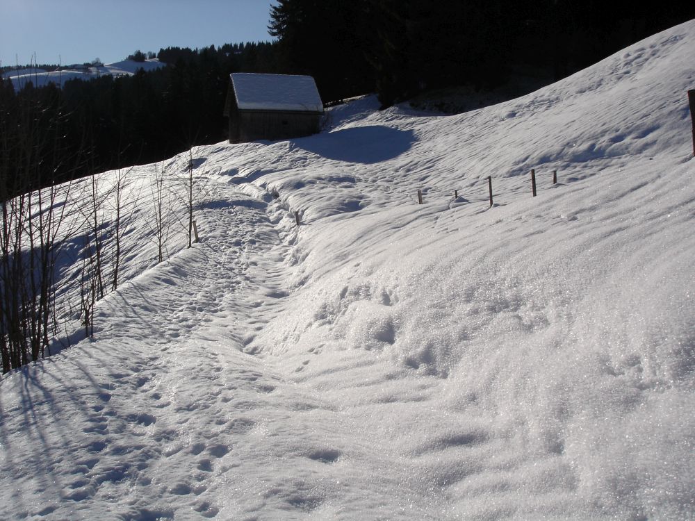 Bei der Anfahrt zum Ausgangsort der Wanderung lesen wir auf Aussenthermometer -14 Grad ab. Entsprechend unangenehm ist es, aus dem warmen Auto auszusteigen und in die kalten Wanderschuhe einzusteigen. Auch unangenehm, dass weit und breit kein Wanderwegweiser zu sehen ist. Wir laufen trotzdem los und fragen eine entgegenkommende Einwohnerin, ob der Weg zum Tanzboden führt. Offensichtlich befinden wir uns nicht auf der Idealroute, aber es müsste ein Durchkommen geben. Sie empfiehlt uns, dort oben beim Stall nach links in den Wald einzutauchen. Vor längerer Zeit schein schon mal jemand den Weg genommen zu haben. Wir verfolgen eine Spur im Schnee, die jedoch immer dünner wird. Gelegentlich ist an einem Baum eine Farbmarkierung zu sehen. Nach mehr als 250 Höhenmetern durch den steilen Wald erreichen wir eine sonnige Lichtung und ein Haus. Jetzt endlich können wir unsere Position auf der Karte ausmachen. Es stellt sich heraus, dass wir den Hang in Richtung Osten queren müssen, bevor wir weiter aufsteigen können. Geeignete Forstwege liegen jetzt tief unterm Schnee und sind kaum auszumachen. Unser Weg endet auch bald aber mit etwas Glück finden wir eine Passage durch den dichten Wald. Schliesslich treffen wir wieder auf offenes Gelände und weitere Spuren von Schneeschuhgängern. Vor uns taucht dann Unterbächen auf, ein Ausflugsziel mit Parkplatz im Sommer, ein verlassenes Haus im Winter. Ab hier bewegen wir uns auf einer vielbegangenen Schneeschuhroute. Wir können kaum glauben, dass wir in der kurzen Zeit zwischen Unterbächen und Oberbächen fast 200 Höhenmeter zurückgelegt haben. Bei Oberbächen stossen wir auf den Toggenburger Höhenweg, der bestens beschildert ist. Auch unser Ziel, der Tanzboden, ist jetzt schon auf Wanderwegweisern zu finden. Eine schmale Schneeschuhspur führt weiter durch den dichten, idyllischen Winterwald bis Stotzweid, wo wir aus dem Wald heraus auf eine lichte Hochebene treffen. Im Osten geniessen wir den Blick zum mächtigen Säntismassiv und im Westen bedauern wir die Anwohner des Zürichsees, die unter der dichten Nebeldecke keine Sonne sehen. Eine knappe Stunde trennt uns noch vom 200 Meter höheren Tanzboden., den wir auf dem vielbegangenen Höhenweg über weite Schneehänge erreichen. Tourenskigänger, Schneeschuhläufer und Schlittenhunde treffen sich hier oben in und an der Wirtschaft Tanzboden. Im Windschatten wärmt die Sonne ausreichend, sodass wir uns einen kleine Rast gönnen. Dann treten wir den Rückweg über einen meist baumfreien Bergrücken an, zurück nach Ebnat. Obwohl wir meist querfeldein in Falllinie hinunter gehen, kommen wir doch oft an Wanderwegweisern vorbei. Am Ortsrand von Ebnat angekommen haben wir noch eine fast 2 km lange Strecke auf einer gefrorenen Dorfstrasse zurück zu legen, bevor sich der Kreis schliesst.