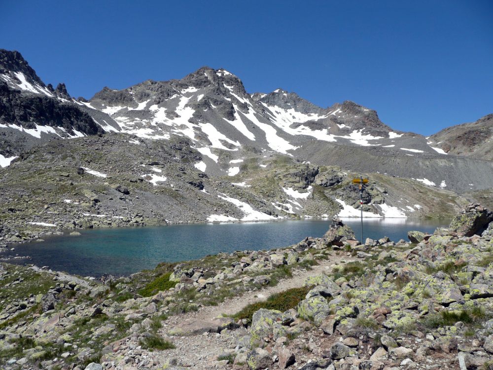 An der Strasse zwischen Lej da Segl (Silsersee) und Lej da Silvaplauna (Silvaplanasee) gibt es einen kleinen Parkplatz auf dem wir unsere Autos gratis abstellen können. Direkt am Parkplatz finden wir einen Wanderwegweiser. Zum Glück entfernt sich der Wanderweg gleich von der vielbefahrenen Hauptverkehrsader Maloja - St. Moritz.Bereits nach fünf Minuten Fussmarsch gibt es die erste Kuriosität zu bewundern, ein Klohäuschen am Wanderweg. Vielleicht gilt das stille Örtchen auch den Reitern von der benachbarten Pferdekoppel. Zwei Minuten später staunen wir über einen Blanko-Wanderwegweiser. Die Wegweiser zeigen in verschiedenen Richtungen, haben aber keine Aufschrift. Wir finden unseren Weg trotzdem, bis nach 5 Minuten eine Kuhherde den Wanderweg blockiert. Da hilft nur ein Ausweichen über den Berghang. Nach weiteren 10 Minuten stossen wir dann endlich an einen ordentlichen Wanderwegweiser mit Aufschrift. Unser Wanderziel, der Lej da la Tscheppa, ist angeschrieben. Jetzt geht es gleich ans Eingemachte. Im Zickzack schlängelt sich der Pfad den steilen Hang hinauf. Schöne Lärchen spenden angenehmen Schatten. Eine Bank an einer exponierten Stelle mit einer herrlichen Aussicht auf Sils und Silsersee zwingt uns schon nach 20 Minuten zu einer kleinen Trinkpause. Noch eine Bank mit noch viel schönerer Aussicht, auch auf den Silvaplanasee, hält uns nach weiteren 10 Minuten Gehzeit nicht auf. Die Baumgrenze haben wir überwunden und mit zunehmender Höhe wird auch die Aussicht noch ein Stück gewaltiger. Einige Felsstufen sind mit einem Seilen gesichert, sind aber technisch absolut problemlos. Schon nach knapp zweieinhalb Stunden ist die Höhendifferenz von 800m überwunden und wir stehen am Ufer des Lej da la Tscheppa. In der Höhe von über 2600m ü.d.M. wächst kaum mehr Gras. Auch das Lüftchen ist eher frisch und wenn man vom anstrengenden Aufstieg durchgeschwitzt ist, empfiehlt es sich, eine Jacke überzuziehen. Wieder einmal suchen wir den Windschatten, um ohne zu frieren eine längere Pause einzulegen. Die Idee, den See zu umrunden, stösst auf helle Begeisterung. Also bleibt es eine Solo-Tour. An manchen Stellen ist das Seeufer zu steil oder Schneebedeckt, so dass ein gewisser Abstand zum See erforderlich ist. Abgesehen von feinerem Schotter ist meistens Blockhüpfen angesagt. Unter den Felsblöcken ist teilweise das Rauschen eines Baches zu vernehmen. Insgesamt macht die Umrundung doch anderthalb Kilometer aus und nimmt eine gute halbe Stunde in Anspruch. Über die karge Hochebene setzen wir unseren Weg in Richtung Nordosten fort. Nur langsam verlieren wir an Höhe. Immer wieder überrascht ein kleines Seelein, in dem sich oft die weissen Berggipfel spiegeln. Gelegentlich haben wir auch mehrere Seen im Blickfeld, das kleine Bergseelein mit der Spiegelung der Berge und der viele Hundert Meter tiefere Silvaplanase mit seinem leuchtendem Türkisgrün. Dann sehen wir auch nach Silvaplana hinunter und schliesslich tauchen die Häuser von St. Moritz im Hintergrund auf. Ab dem Zeitpunkt, wo wir die Julier-Passstrasse sehen, wird es ordentlich steil. Im Zickzack steigen wir den Nordhang ab. Je weiter wir nach unten kommen, desto grüner wird die Landschaft. Unterhalb der Baumgrenze sorgt der Wald für angenehmere Temperaturen. Nach knapp zwei Stunden stossen wir auf den Engadiner Höhenweg (Via Engiadina). Wir wollen auf diesem Höhenweg bleiben, da dieser bis zum Ausgangspunkt unserer Wanderung zurück führt. Zunächst legen wir aber eine kurze Trinkpause ein und sammeln neue Kräfte. Auf der Strecke erwarten wir eine Abzweigung nach Silvaplana hinunter, weshalb wir uns an einer unbeschrifteten Weggabelung für den oberen (rechten) Weg entscheiden. Da mehrere Hundert Meter keine Wegmarkierung mehr auftaucht und der Weg einen Bogen in eine unsympathische Richtung macht, drehen wir um und queren weglos zum unteren Weg. Kurz darauf taucht auch die Abzweigung nach Silvaplana auf. Ganz entspannt laufen wir auf dem leicht abfallenden Engadiner Höhenweg, der sich schliesslich wieder zu einem Pfad verjüngt, in Richtung Südwesten. Durch die Baumlücken können wir immer wieder das leuchtende Türkisgrün des Silvaplanasees sehen. Nach einer guten Stunde erreichen wir den Parkplatz an der vielbefahrenen Strasse zwischen den beiden Seen. | ||||||||||||