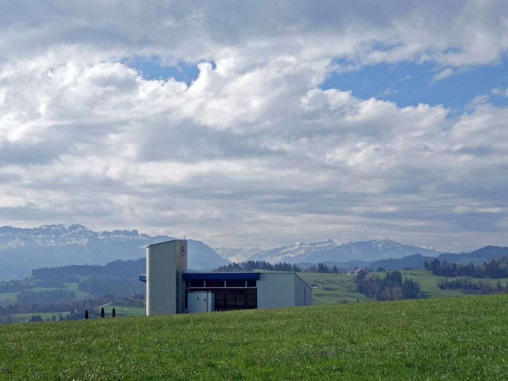 Hasenschwand ist auf dem Wanderwegweiser mit einer Gehzeit von 1 Std. angeschrieben. Dort wollen wir aber auf dem Rückweg her kommen, also drehen wir um und laufen am Ufer der Kleinen Emme südwärts in Richtung Steinhuserberg, der am Wanderwegweiser mit einer Gehzeit von 1 Std. 15 Min. angeschrieben ist. Wir sehen eine Sitzbank aus 4 Paar Stoeckli-Skiern, kein Wunder, befindet sich in der Nähe die Produktionsstätte dieser Schweizer Markenskier, und passieren ein mehrgestöckiges Terrassenhaus mit einem beeindruckenden Liftturm zwischen den Gebäuden. Neunhundert Meter nach der Kehrtwende am Wanderwegweiser endet das ufernahe Strässchen und ein Schotterweg windet sich den Berg hinauf. Wanderer kürzen aber die erste Kehre über einen schmalen, steilen Fusspfad ab. Vorbei an einem Häuschen in bester Aussichtslage, mit herrlichem Blick über Wolhusen, passieren wie ein weiteres, sehr altes, sicher unbewohntes Bauernhaus, zwischendurch auf einem asphaltierten Wegabschnitt, und stossen nach einem Hohlweg durch den Wald auf ein Betonsträsschen. Zwei Betonspuren führen zum Schrufenegg hinauf und nach rechts zweit ein Wirtschaftsweg zur Schattweid ab. Wir Rasten nach den ersten einhundertfünfzig Höhenmetern erst mal einen Moment und geniessen dabei den herrlichen Blick auf die Häuser von Wolhusen hinab. Die Betonspuren gehen nach knapp dreihundert Metern beim Schruffenegg in Asphalt über, auf dem wir nach weiteren vierhundert Metern den Bauernhof Mättenlehn passieren. Zwischen den Gebäuden des Bauernhofes hindurch zeigt die Markierung des Wanderweges auf einen weniger ausgeprägten Wiesenpfad, auf dem wir knapp zweihundert Meter bis zu einem einzelnen Baum mit Sitzbank auf eine Anhöhe hinauf laufen. Nicht erst von hier, sondern schon während des Anstiegs, geniessen wir eine herrliche Sicht auf viele schnebedeckte Berggipfel der Alpen, angefangen vom Pilatus, bis zu den uns nicht bekannten Gipfeln der Berner Alpen. Der Weg, der sich Alpenpanoramaweg (3) nennt, hat seinen Namen wirklich verdient. Fast auf einer Höhenlinie laufen wir einen kaum ausgetretene Wiesenspur in südwestliche Richtung und haben dabei ständig das herrliche Alpenpanorama vor Augen. Das markante Gebäude, das nach einiger Zeit am Ende der Wiese auftaucht, entpuppt sich als die Kirche von Steinhuserberg. Erst nach sechshundertfünfzig Metern mündet der Wiesenpfad beim Wanderwegweiser Steinhuserberg, Nahe dem Bauernhof Oberschwendi, in ein Asphaltsträsschen. Panoramatafeln führen die Namen vieler Berge auf, die von hier aus zu sehen sind. Gerade mal zweihundert Meter folgen wir dem Asphaltsträsschen in nordwestliche Richtung. Dann zweigt bei einem Holzlager nach Westen ein Wiesenpfad ab, auf dem wir nach vierhundert Metern den schmucken Bauernhof Hinterätzleschwand erreichen. Wieder haben wir zwei Betonspuren vor Augen, die auf eine kleine Anhöhe hinauf führen. Die rote Seilbahnkabine mit Aufschrift Trübsee, die schon von weitem ins Auge sticht, entpuppt sich als Schutzhütte mit Biertischgarnitur, Holzofen und Notstromaggregat. Weglos steigen wir noch bis zu einem Gipfelkreuz auf die Anhöhe hinauf und genauso weglos über die Wiesen wieder Richtung Norden zum Normalweg hinab. Auf dem Normalweg, einem Wirtschaftsweg fast auf einer Höhenlinie, laufen wir zunächst über eine grüne Hochebene und blicken über die Häuser von Hinterhochwart hinweg zum entfernten Bergdorf Menzberg hinüber. Dann setzt sich der Wirtschaftsweg durch bewaldetes Gebiet fort und mündet schliesslich nach gut anderthalb Kilometern am Waldrand wieder in ein Asphaltsträsschen. Beim Bauernhof Längebüelschür, den wir über das Asphaltsträsschen nach einem halben Kilometer in nordwestlicher Richtung erreichen, staunen wir über ein grosses Holzfass mit Ziegeldach, das zu einem kleinen Selbstbedienungskiosk umfunktioniert wurde. Auf dem als Wanderweg markierten Wirtschaftsweg verlassen wir den Bauernhof in westliche Richtung und finden nach dreihundert Metern am Waldrand eine noble Grillstelle. Der grosse Tisch, die gute Aussicht und die Sonne laden zum Rasten ein. In einem Kasten an einem Baum entdecken wir einen Kalender, in den einige Reservierungen für die Nutzung der Grillstelle eingetragen sind. Gerade mal fünfzig Meter nach der Grillstelle verlassen wir den Alpenpanoramaweg und zweigen am Wanderwegweiser nach Norden in Richtung Bärrüti ab. Dieser Etappenpunkt ist mit einer Gehzeit von 40 Min. angeschrieben. Und Wolhusen, das Ende unserer Wanderung ist mit einer Gehzeit von 2 Std. angeschrieben, dabei ist es erst 13:00 Uhr. Erst nach zweihundert Metern wendet sich der Wanderweg im Wald in östliche Richtung. Im leichten Abstieg, zunächst durch den Wald, dann gottlob in der Sonne, verlieren wir auf den 1,3 Kilometern bis zum Bauernhof Unterlängebüel etwa einhundert Höhenmeter. Zweihundert Meter nach dem Bauernhof endet der Wirtschaftsweg in einer Wiese. Weiter unten, am Waldrand sehen wir eine Wanderwegmarkierung. Wir schenken und den Schlenker um den Wiesenhang und laufen weglos direkt zu dieser Wanderwegmarkierung hinunter. Nach einem Gatter laufen wir einen laubbedeckten Waldweg hinab, der zunehmend in Nagelfluh eingebettet nach einer Rechtskurve senkrechte Wände passiert und auf einen Wasserfall zusteuert. Von der Felsoberkante purzelt das Wasser herunter und der Wanderpfad führt entlang der Felswand in einem 180-Grad-Linksbogen hinter dem Wasserfall hindurch. Wir fotografieren durch das fallende Wasser in den Tobel, in dem das Wasser kurze Zeit später in das Flüsschen Wigger mündet. Nachdem wir ausgiebig den Wasserfall bestaunt haben, laufen wir nordostwärts vom Wasserfall weg, auf einem schmalen Pfad, der stellenweise der Witterung nicht Stand halten konnte und nach unten weggespült wurde. Der Wanderweg macht nun einen Rechtsbogen und mündet nach etwa dreihundert Metern bei Bärrüti am Wiggerufer in einen Wirtschaftsweg. Eine Zusatztafel an einer Wanderwegmarkierung zeigt hier an, dass der weiterfü